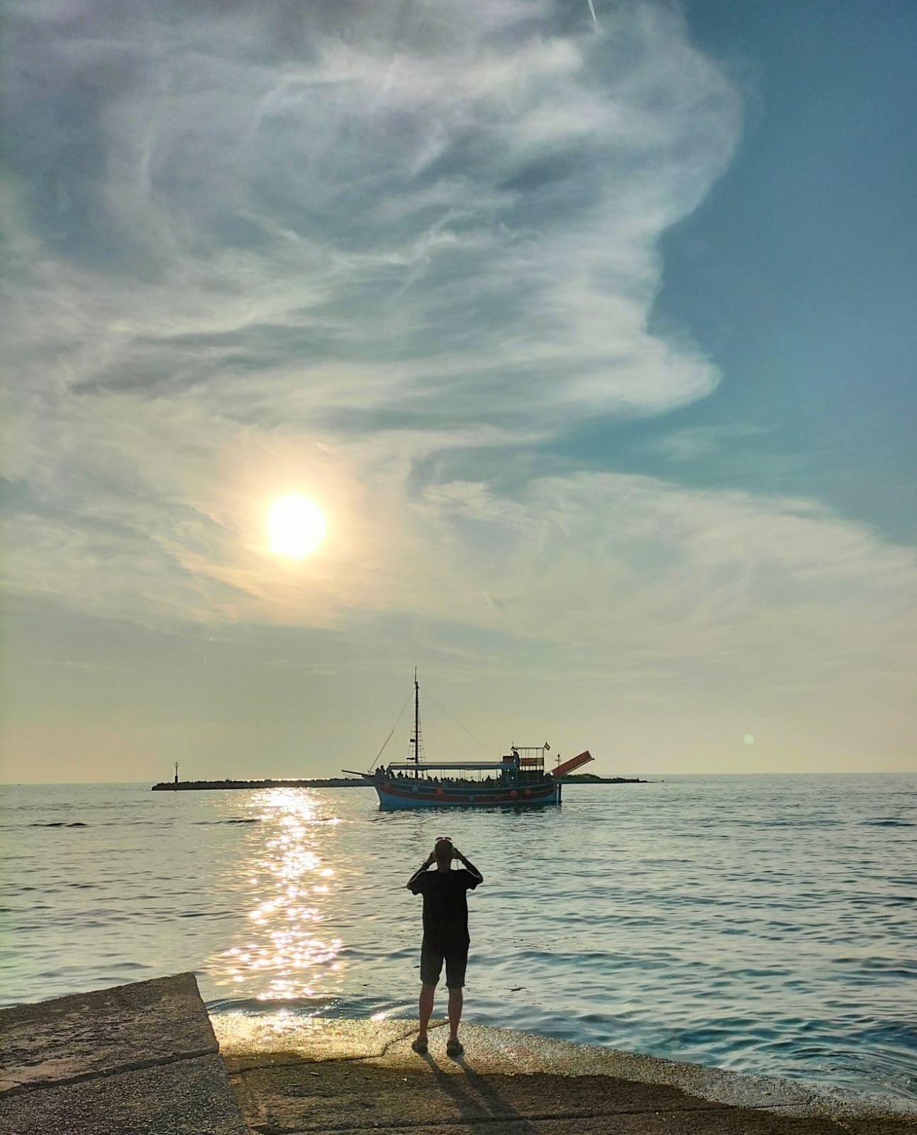 Einmal noch am Hafen entlang, die einfahrenden Schiffe genießen und die tiefstehende Sonne. Ich steige zweimal kurz mit der Drohne auf, aber nicht lange die Möwen mögen keine Konkurrenz, so dass ich bald wieder lande.