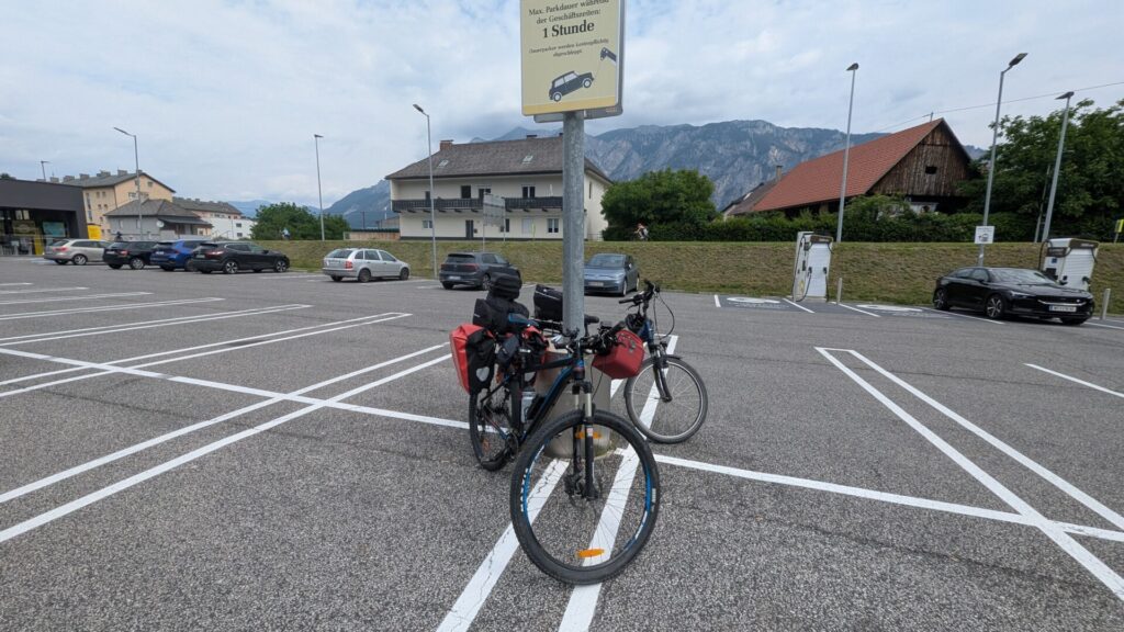 Kaum hat man die unscheinbare Grenze überschritten – schwupps, schon ist man in Italien! Einzig das Italien Schild, zeugt davon das man ein anderes Land betritt. Und das merkt man sofort, nicht nur am Espresso, der plötzlich viel besser schmeckt. Der Radweg folgt hier einer ehemaligen Bahntrasse, und das ist einfach genial. Einige Steigungen und 10 km später sind wir in Tarvis, wir fahren jedoch auf der alten Bahntrasse vorbei, noch ist nicht Zeit für eine Pause. Nach Tarvis geht es ins Kanaltal, nach der letzten Steigung folgt nur noch ein sanftes Gefälle, das einen fast wie von selbst rollen lässt. Ein Traum für alle, die das Panorama genießen wollen, ohne sich gleich die Oberschenkel zu ruinieren. Der starke Gegenwind hebt diesen Vorteil leider etwas auf. Generell ist es nicht so schön wie erhofft, es gibt dunkle Wolken und den erwähnten Wind.
