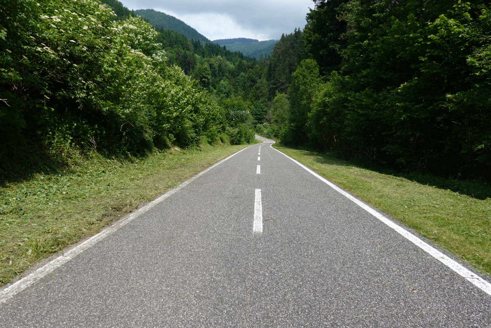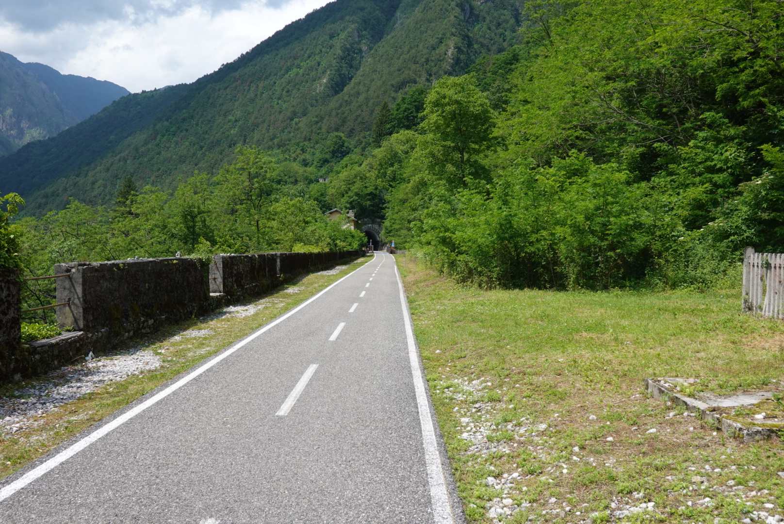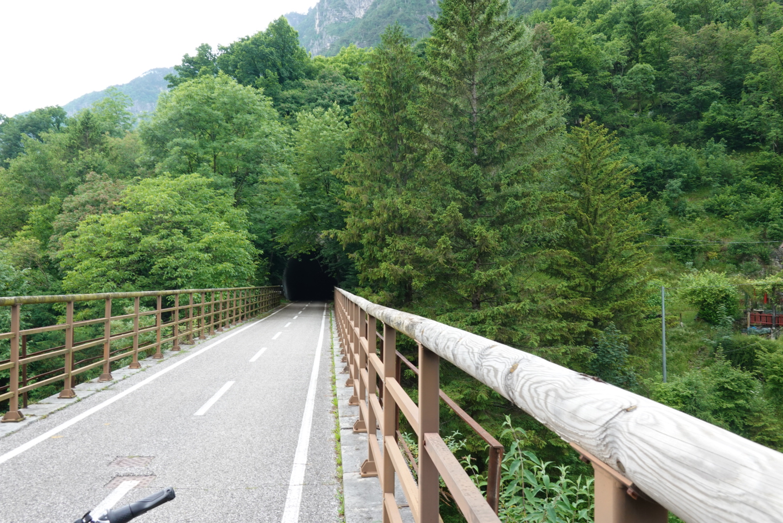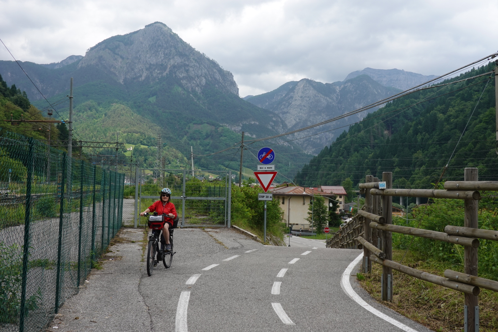 Kaum hat man die unscheinbare Grenze überschritten – schwupps, schon ist man in Italien! Einzig das Italien Schild, zeugt davon das man ein anderes Land betritt. Und das merkt man sofort, nicht nur am Espresso, der plötzlich viel besser schmeckt. Der Radweg folgt hier einer ehemaligen Bahntrasse, und das ist einfach genial. Einige Steigungen und 10 km später sind wir in Tarvis, wir fahren jedoch auf der alten Bahntrasse vorbei, noch ist nicht Zeit für eine Pause. Nach Tarvis geht es ins Kanaltal, nach der letzten Steigung folgt nur noch ein sanftes Gefälle, das einen fast wie von selbst rollen lässt. Ein Traum für alle, die das Panorama genießen wollen, ohne sich gleich die Oberschenkel zu ruinieren. Der starke Gegenwind hebt diesen Vorteil leider etwas auf. Generell ist es nicht so schön wie erhofft, es gibt dunkle Wolken und den erwähnten Wind.