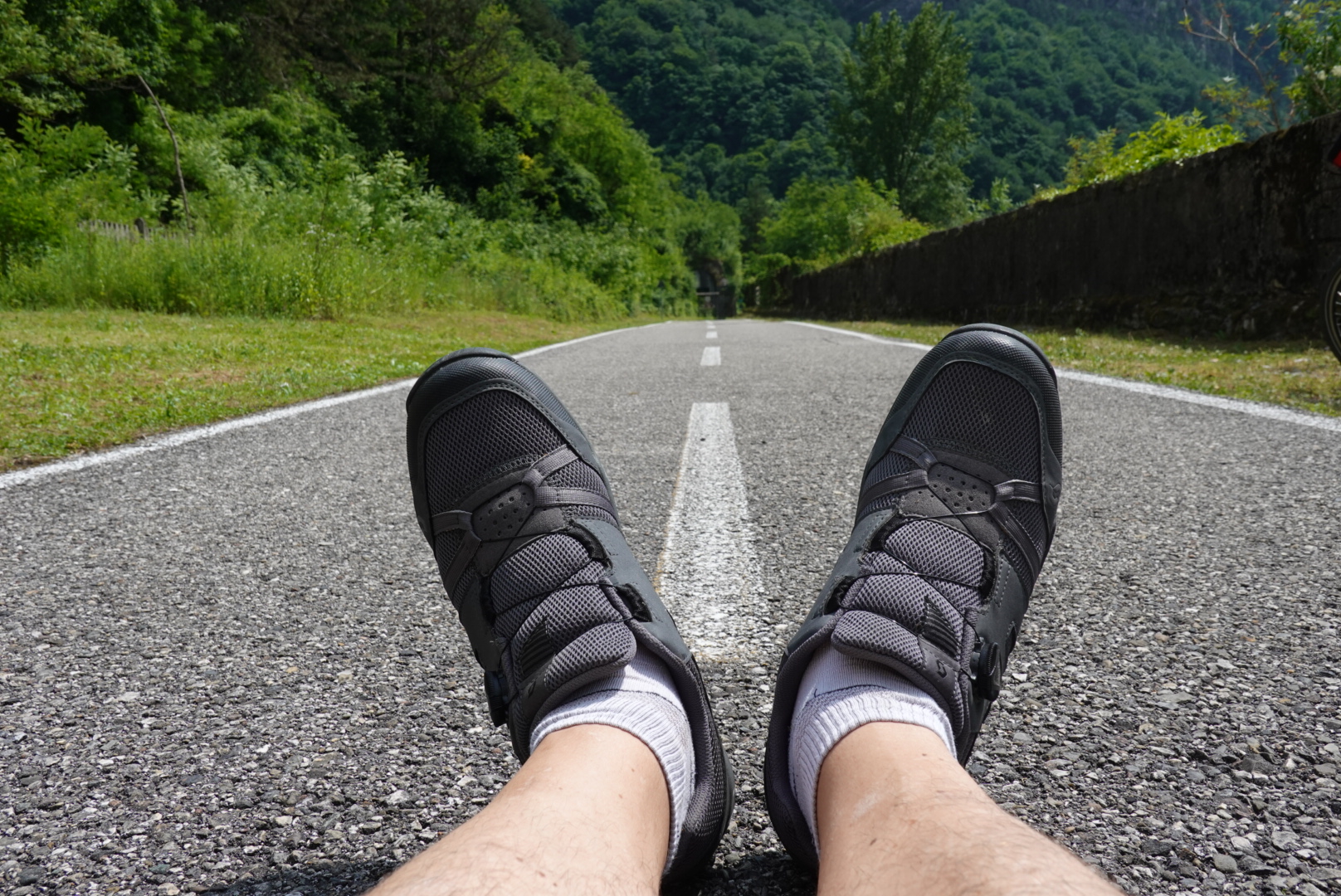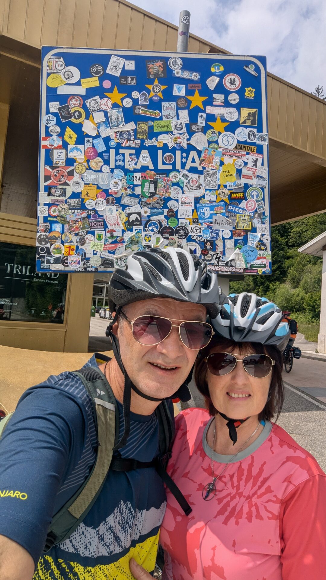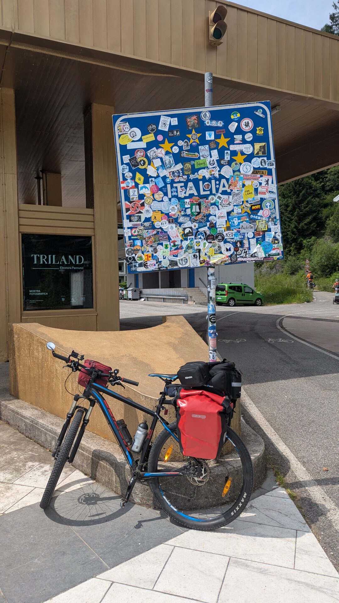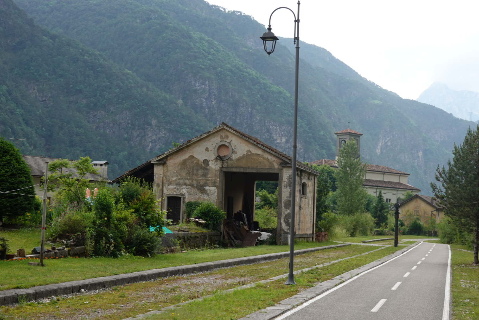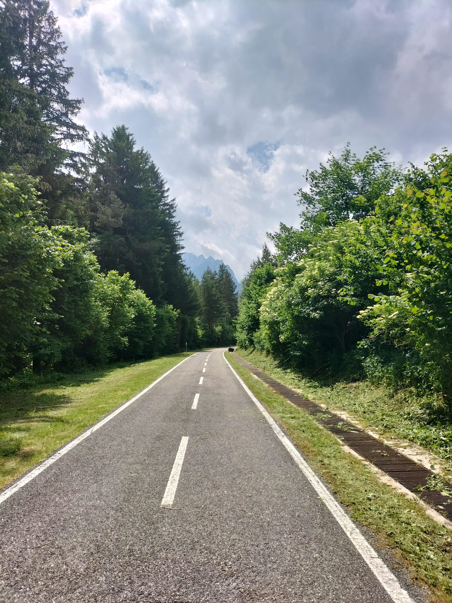Kaum hat man die unscheinbare Grenze überschritten – schwupps, schon ist man in Italien! Einzig das Italien Schild, zeugt davon das man ein anderes Land betritt. Und das merkt man sofort, nicht nur am Espresso, der plötzlich viel besser schmeckt. Der Radweg folgt hier einer ehemaligen Bahntrasse, und das ist einfach genial. Einige Steigungen und 10 km später sind wir in Tarvis, wir fahren jedoch auf der alten Bahntrasse vorbei, noch ist nicht Zeit für eine Pause. Nach Tarvis geht es ins Kanaltal, nach der letzten Steigung folgt nur noch ein sanftes Gefälle, das einen fast wie von selbst rollen lässt. Ein Traum für alle, die das Panorama genießen wollen, ohne sich gleich die Oberschenkel zu ruinieren. Der starke Gegenwind hebt diesen Vorteil leider etwas auf. Generell ist es nicht so schön wie erhofft, es gibt dunkle Wolken und den erwähnten Wind.
