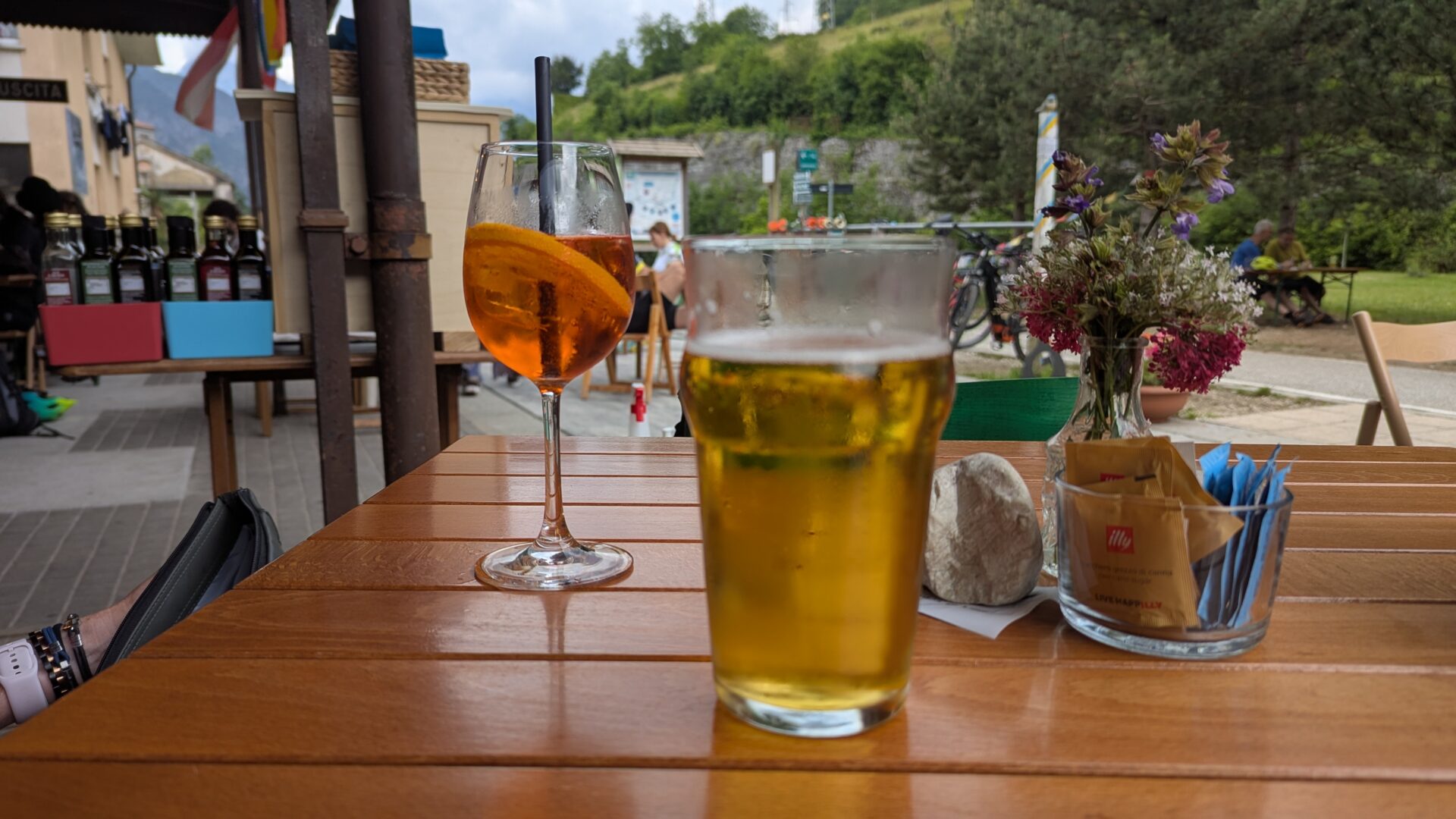 Und dann, endlich, der Regen lässt nach, wir radeln die letzten 10 km – Tutto Gas. Der Dom von Gemona mit seiner beeindruckenden Fassade grüßt schon von Weitem. Die Stadt selbst ist lebendig und charmant, mit gemütlichen Plätzen und Trattorien, die nach einem langen Radeltag genau das Richtige sind. Leider ist unser Hotel etwas abseits der Stadt und es fängt wieder an zu regnen. Also lassen wir den Abend gemütlich in der Pizzeria des Hotels ausklingen. Das Hotel selbst ist ruhig und gemütlich, sehr angenehm nach der Etappe. Es stehen zum Andenken an die alte Zeit auch Loks im Hof.