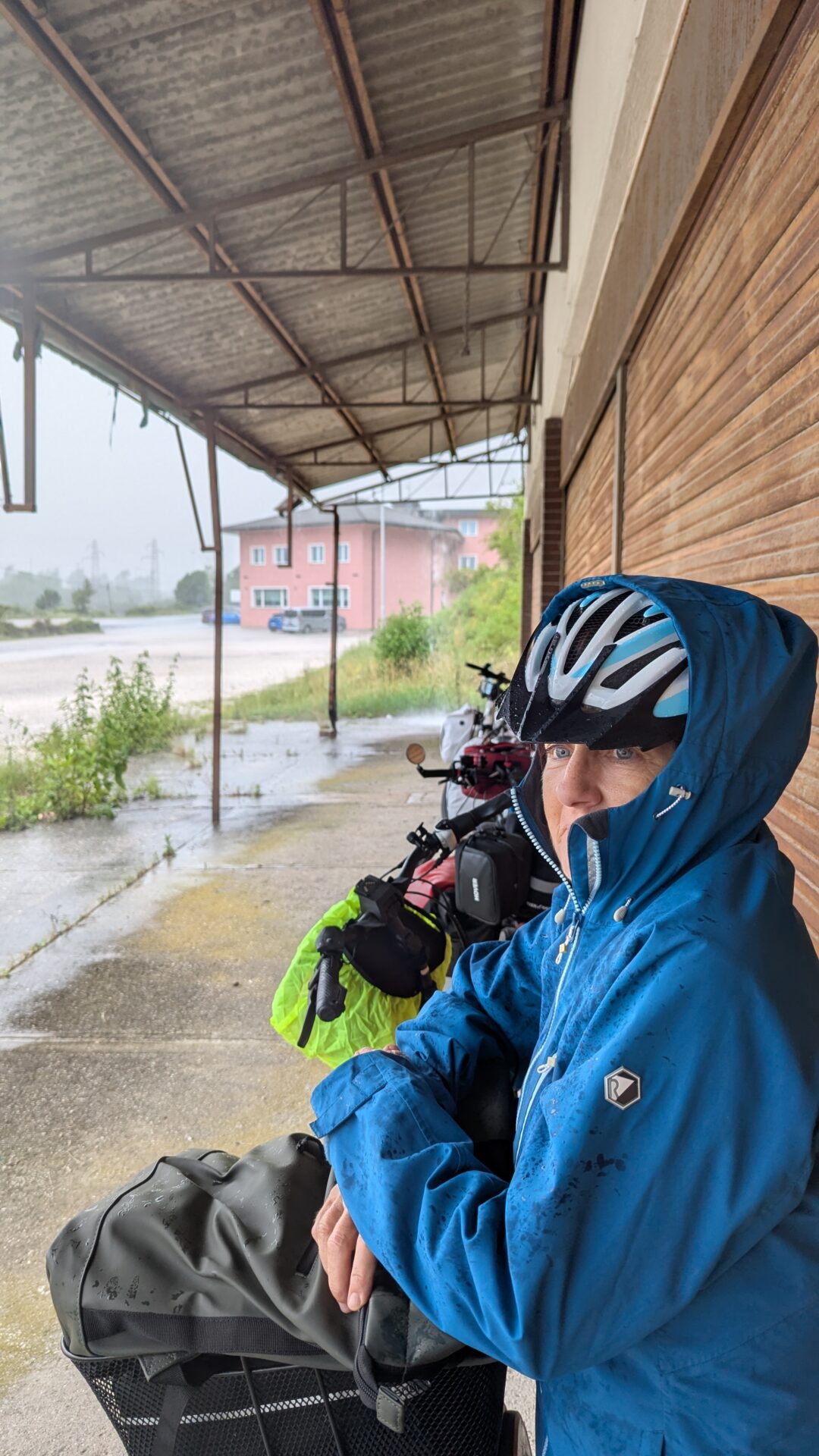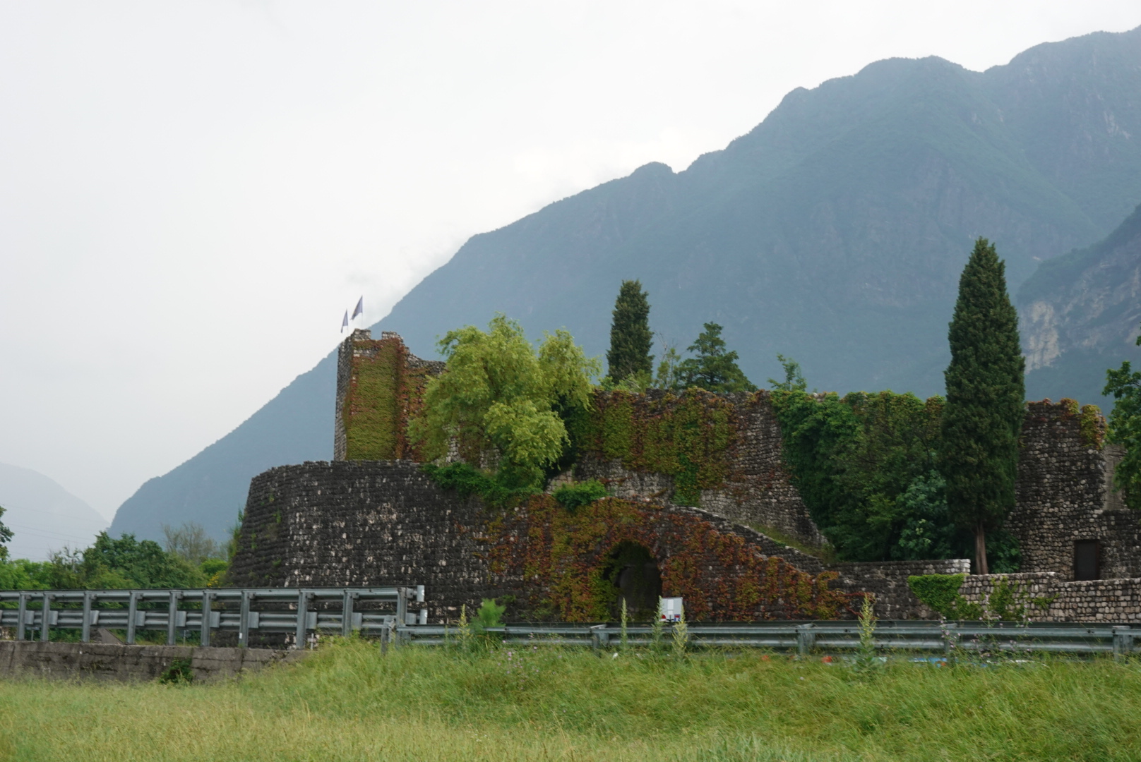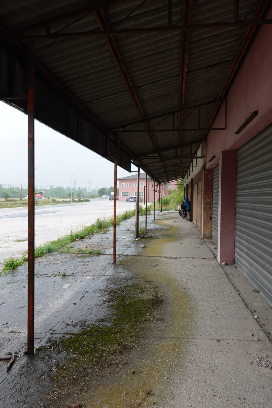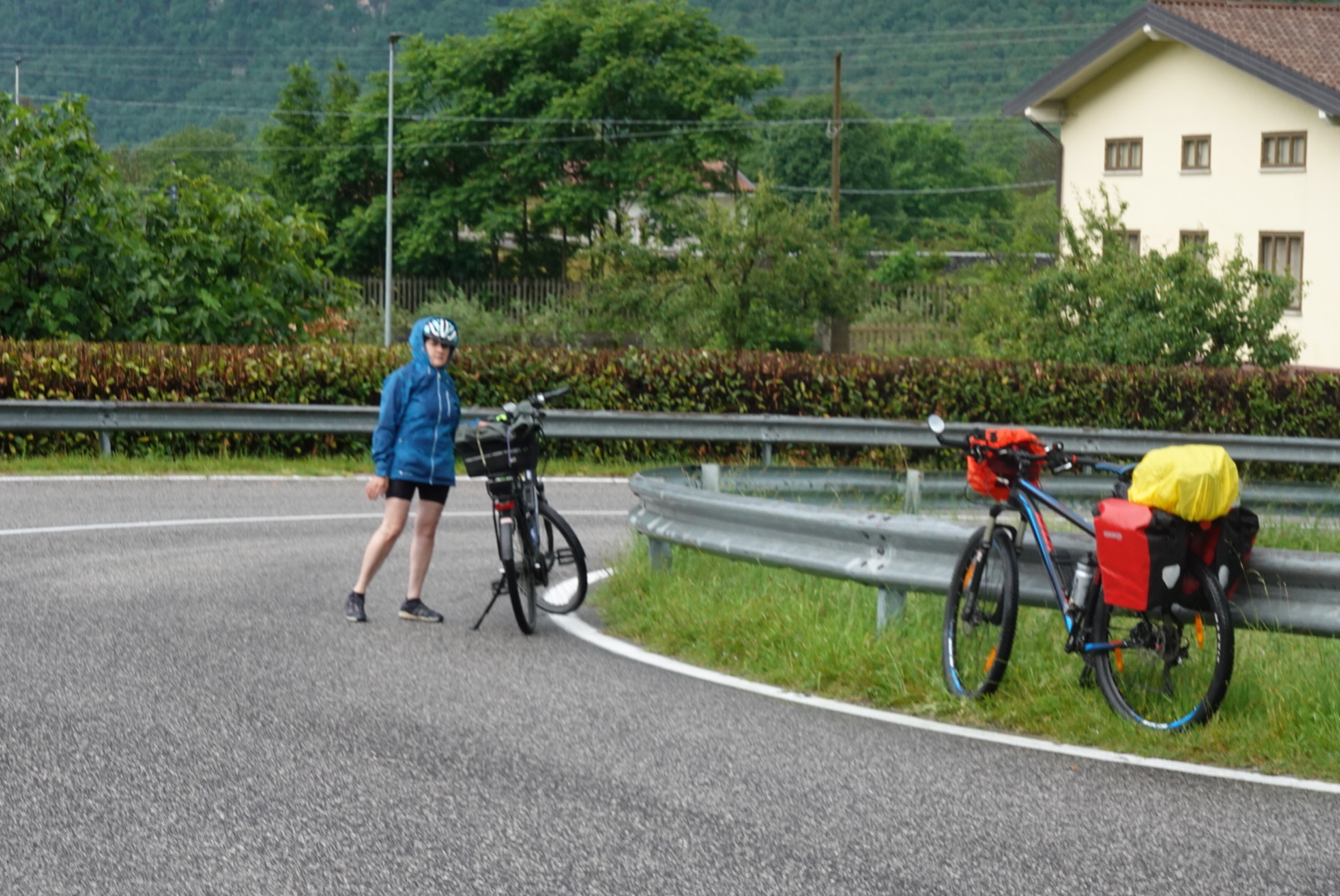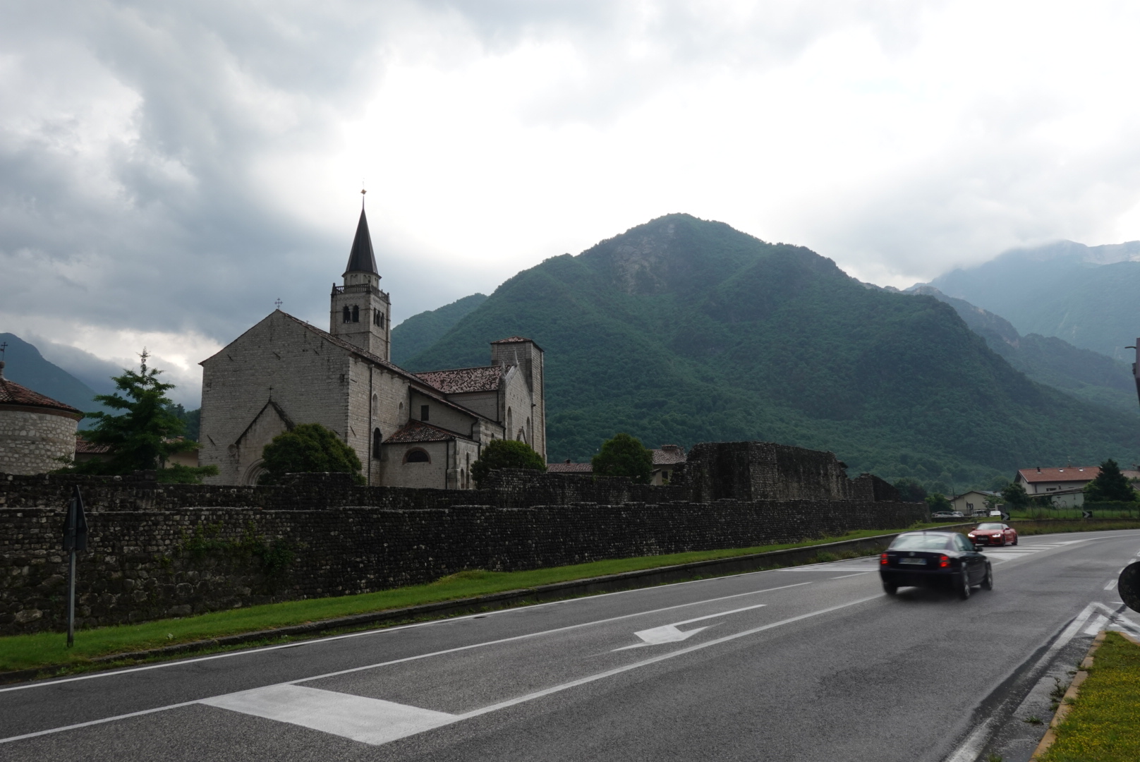 Bevor man Gemona erreicht, kommt man an Venzone vorbei, und das ist ein ganz besonderer Stopp. Diese mittelalterliche Stadt wurde 1976 durch ein verheerendes Erdbeben fast komplett zerstört, aber mit unglaublicher Liebe zum Detail und Entschlossenheit Stein für Stein wiederaufgebaut. Dieses Mal haben wir jedoch keine Zeit, 3 km vor Venzone erwischt uns der Regen. Glücklicherweise finden wir bei einem alten Lagerhaus einen Unterstand, um das Schlimmste abzuwarten.