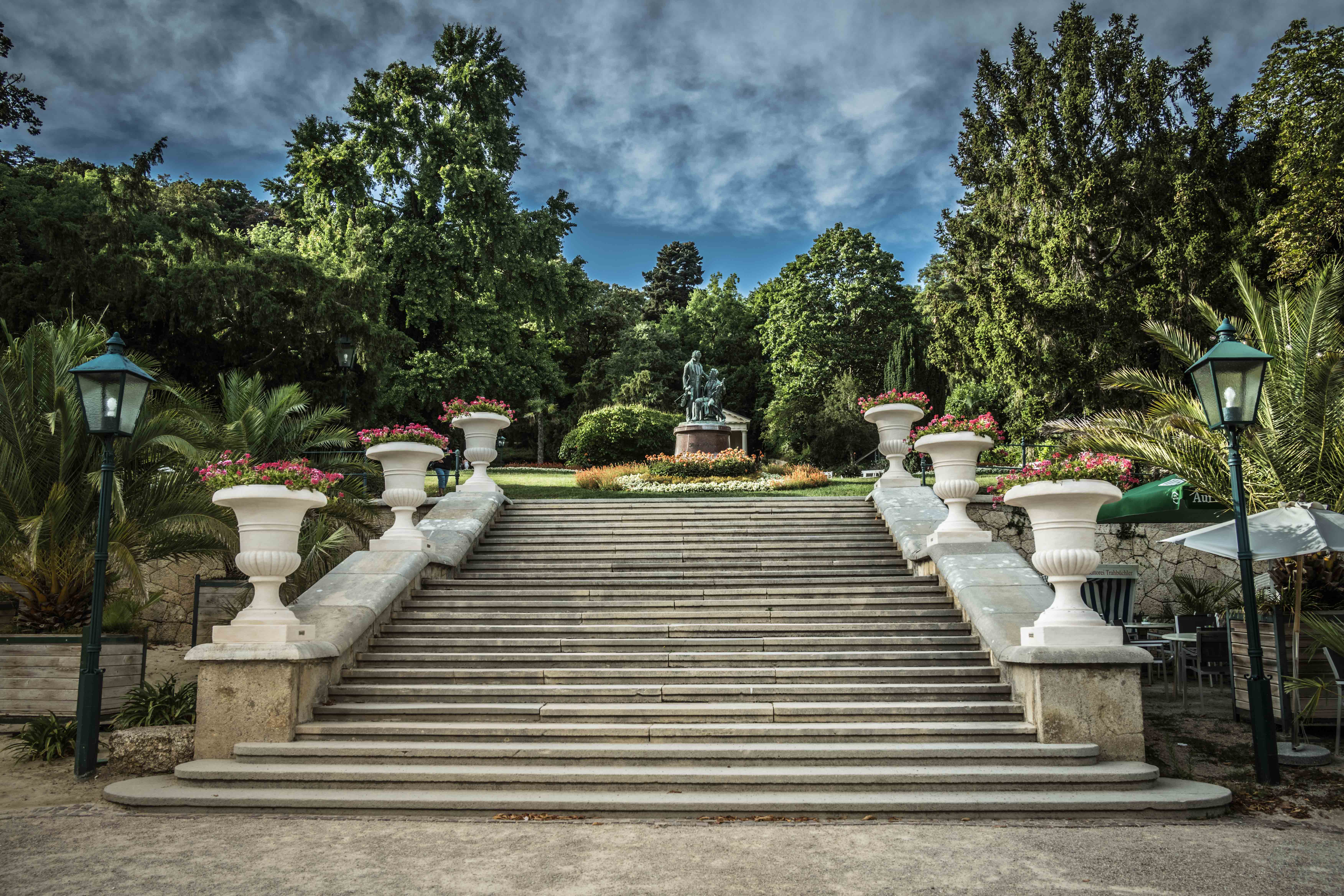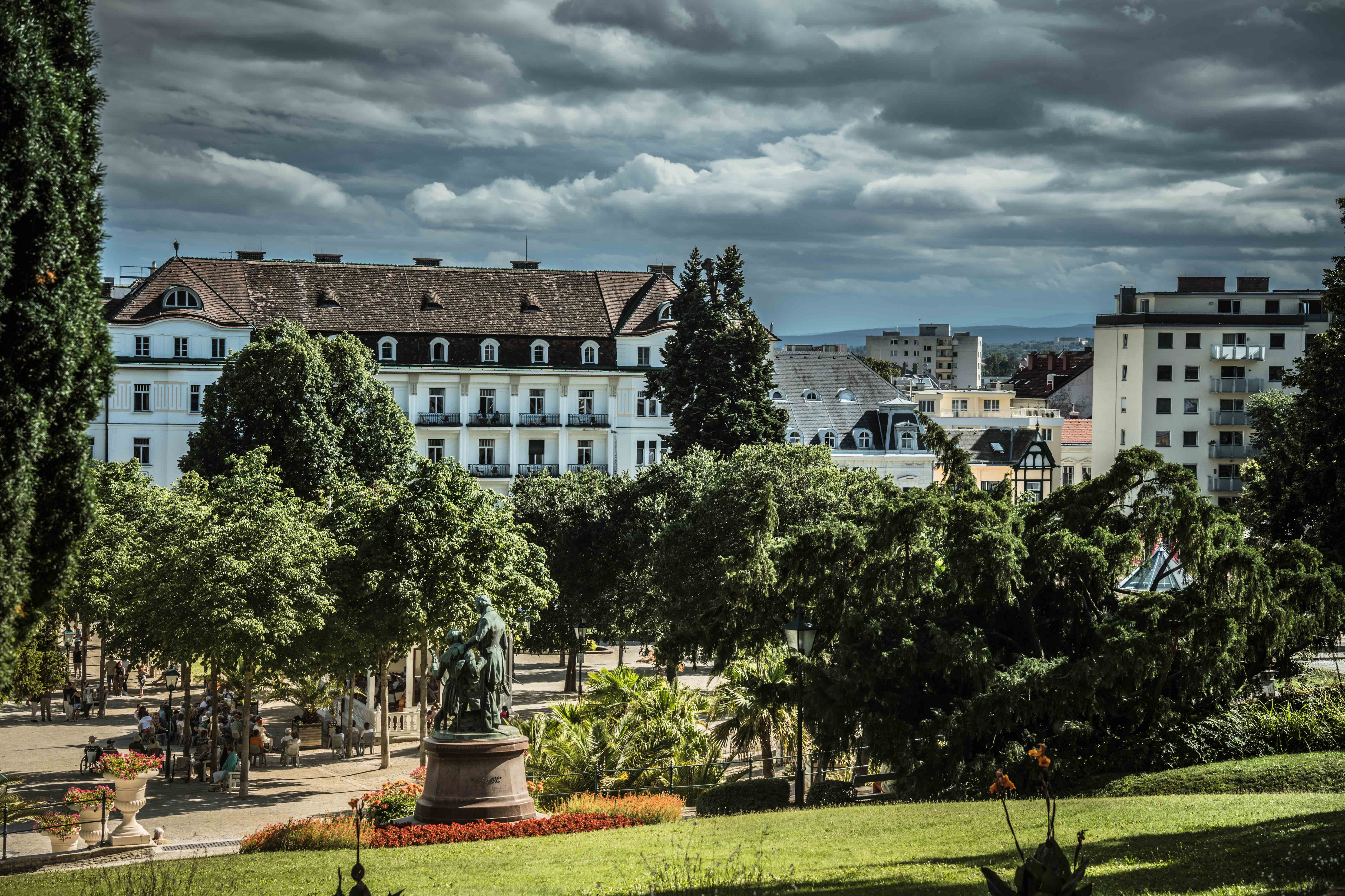 Im Café Lehner stärkten wir uns mit Kaffee und Kuchen. Leider war die Cremeschnitte aus, aber das Mohnkipferl war köstlich. Vom Wiener Charme merkte man glücklicherweise nichts – die Bedienung war sehr freundlich. Anschließend spazierten wir in den Kurpark, vorbei an den Lanner- und Strauss-Denkmal, zur Bellevue-Aussicht. Der Ausblick über Baden war fantastisch.