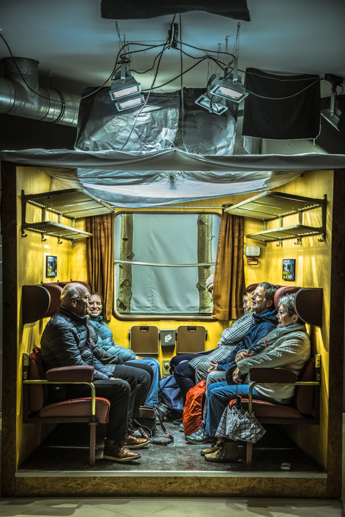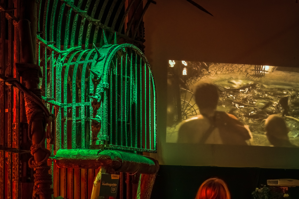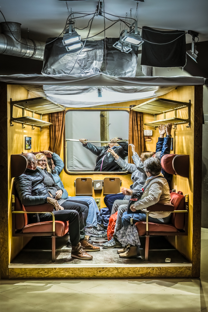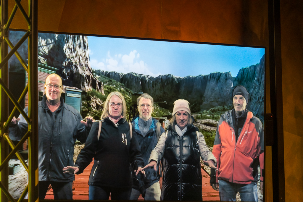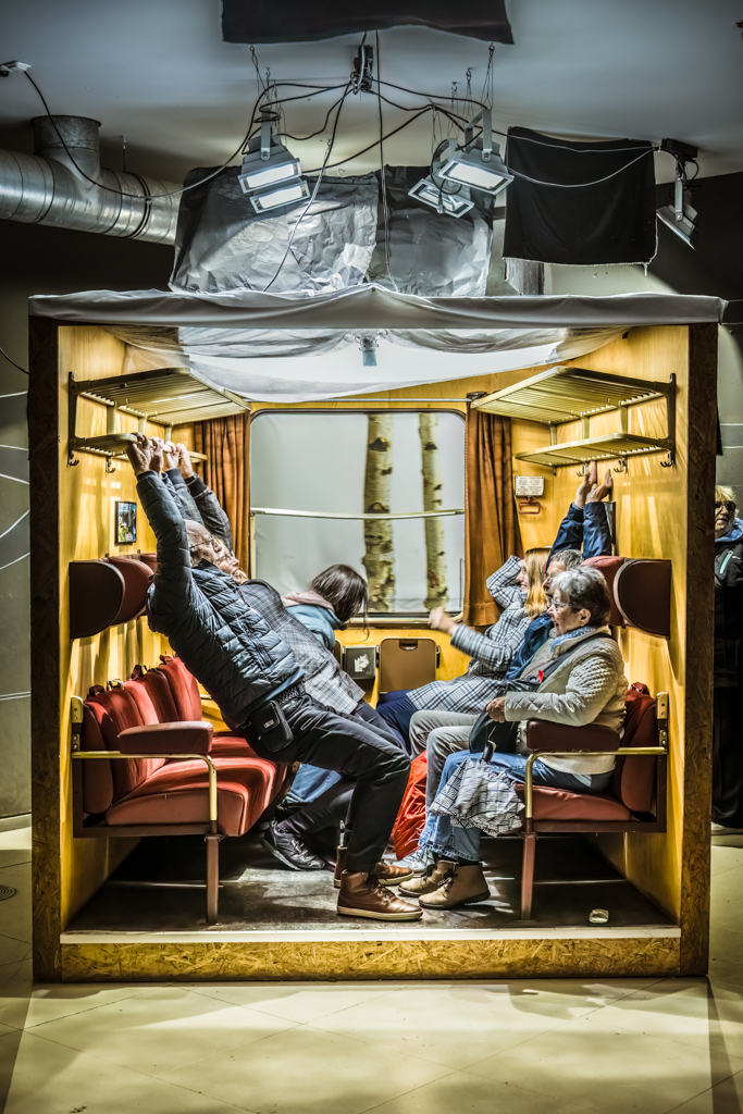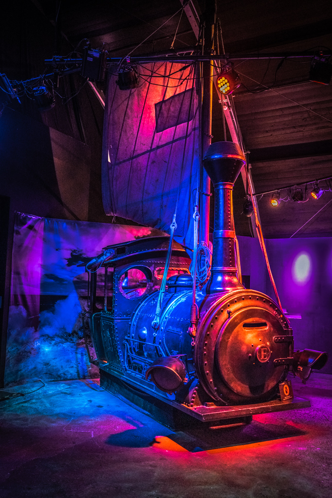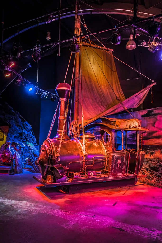 Interessanter ist die letzte Station, in der demonstriert wird, wie früher Szenen gefilmt wurden. Als Beispiel dient eine Bahnfahrt, die ziemlich turbulent ist. Es geht steil bergauf und bergab, Passagiere versuchen den Zug zu erreichen und laufen am Fenster vorbei, während die Bäume eines Waldes am Zugfenster vorbeiziehen.