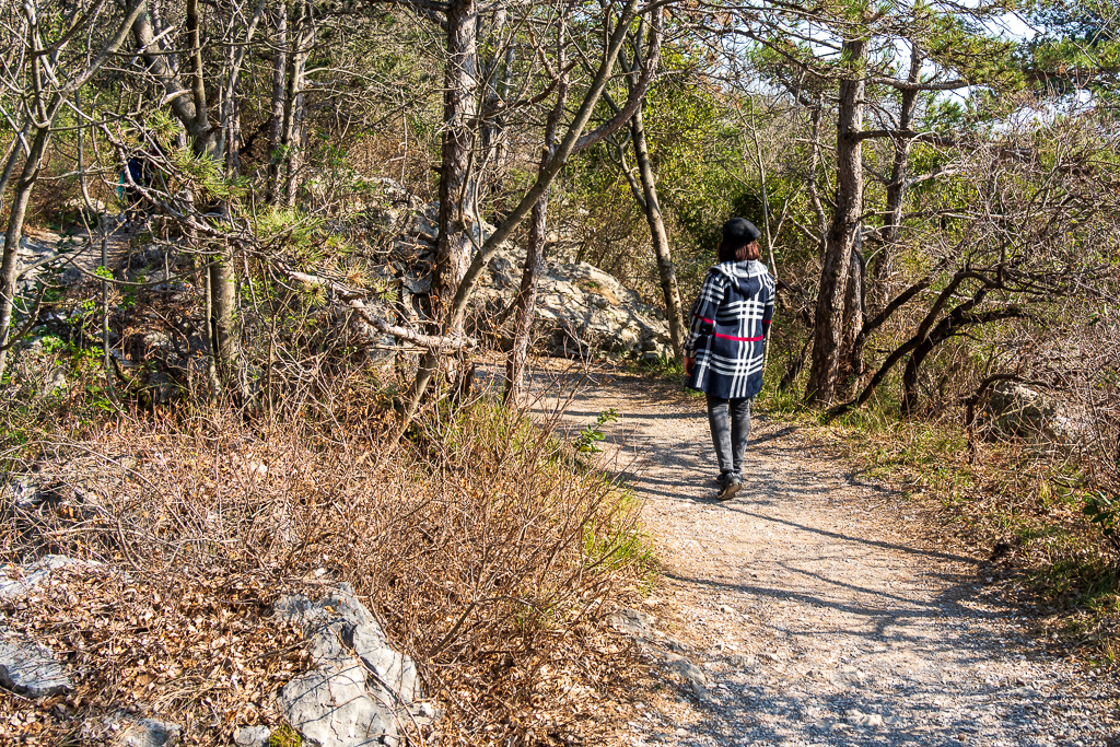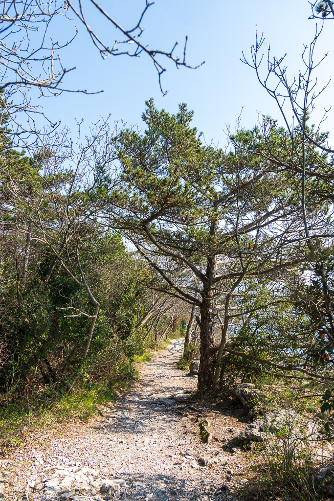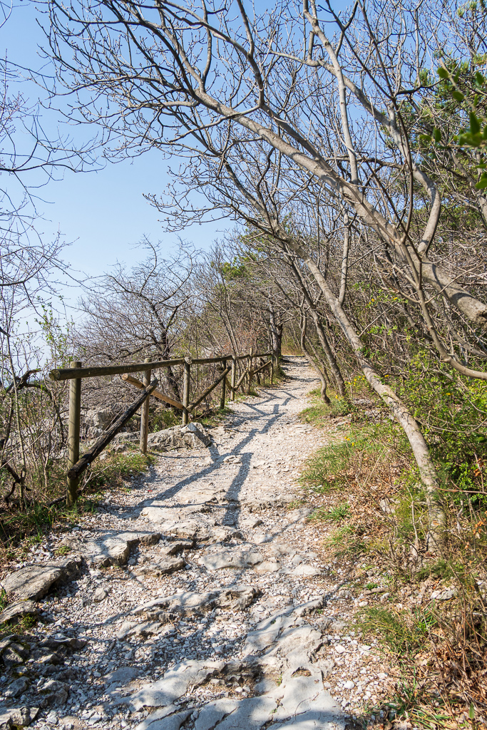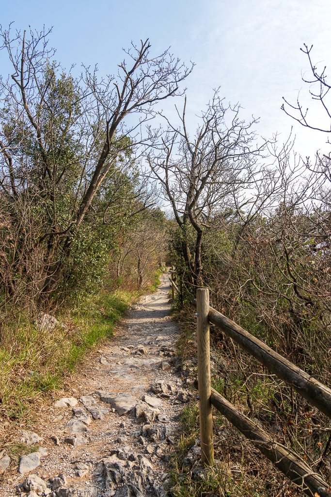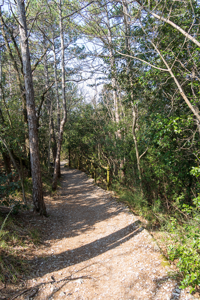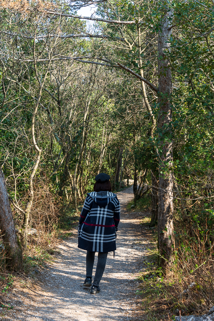 Wir parken beim Parcheggio Sentiero Rilke, was nichts anderes als eine breite, flache Böschung neben der Bundesstraße ist. Hier befinden wir uns ungefähr in der Mitte des Wanderweges. Nach ein paar Minuten Waldweg erreicht man den eigentlichen Wanderweg. Hier kann man entscheiden, ob man Richtung Westen oder Osten zum Schloss geht. Wir biegen Richtung Schloss ab.