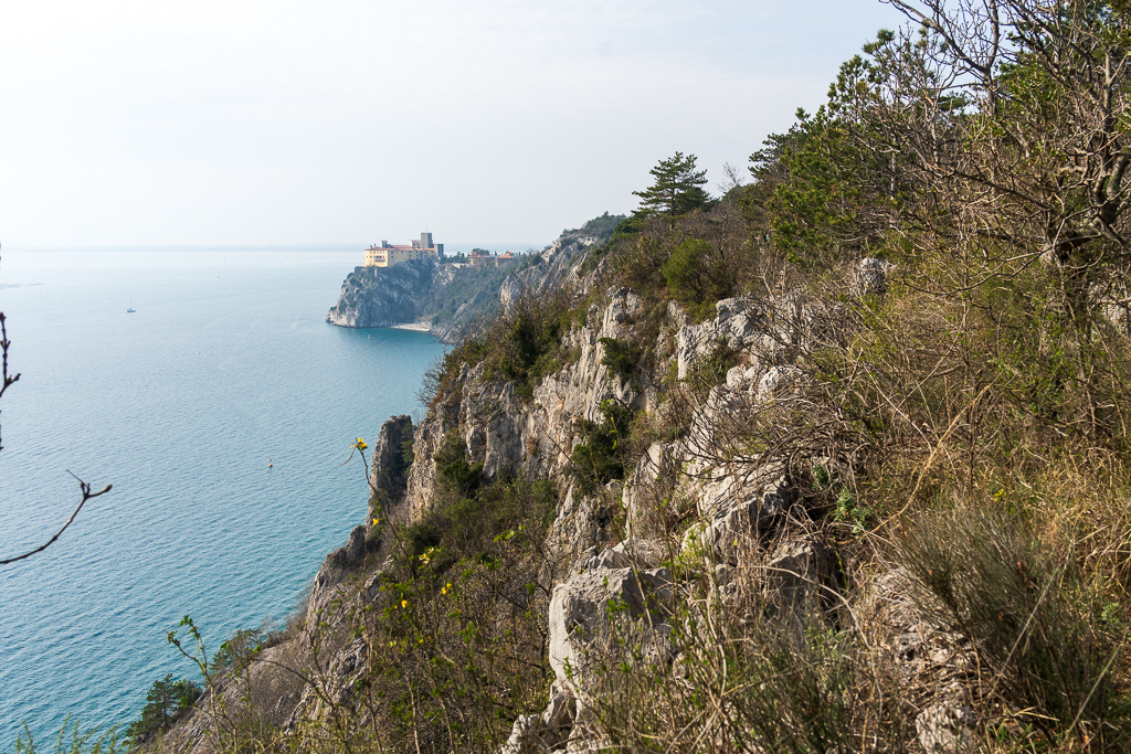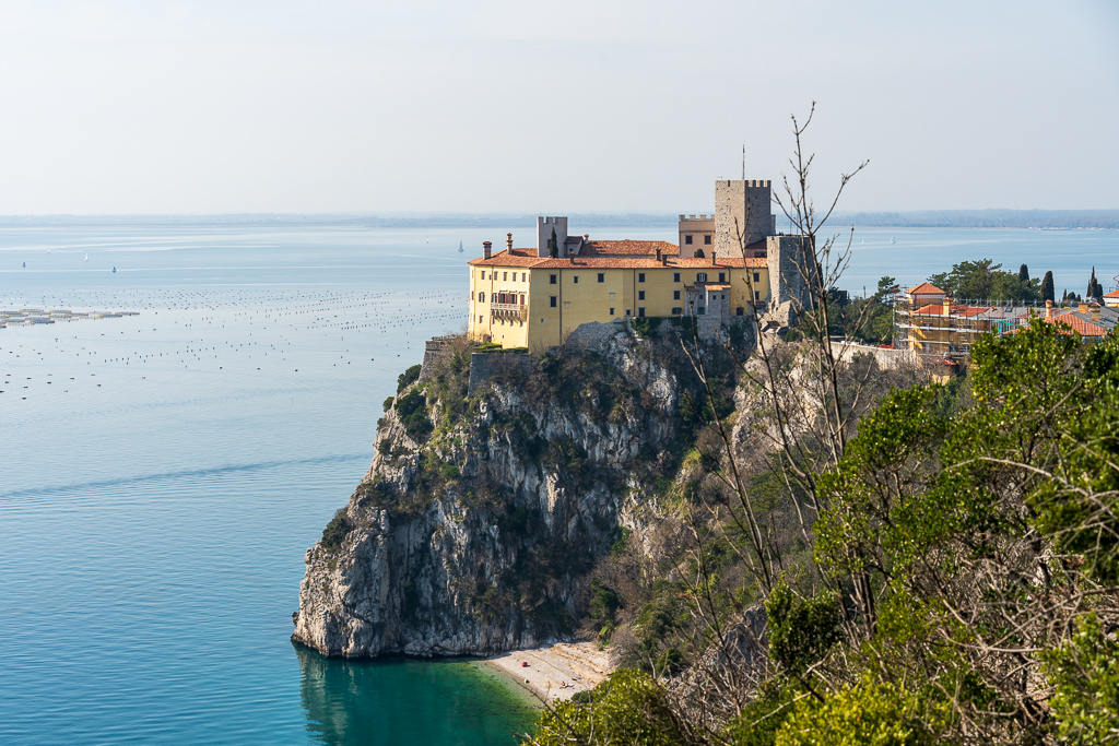 Von weiten erblicken wir schon das Schloss Duino. Dieses beeindruckende Schloss thront auf einer Klippe über dem Meer und blickt auf eine lange und bewegte Geschichte zurück. Man sieht es relativ gut, und es gibt immer wieder Stellen, wo man das Schloss gut fotografieren kann.