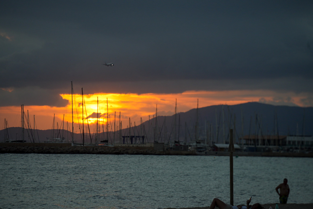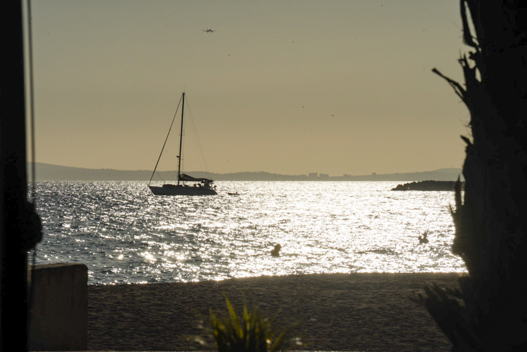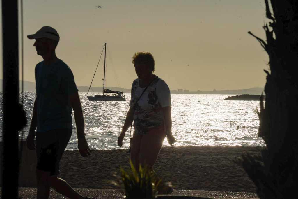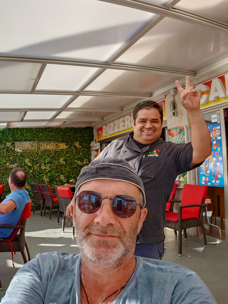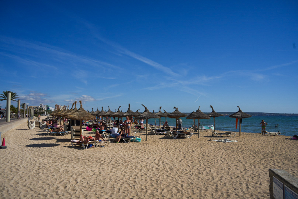 Dort finden wir in der Nähe des Hotels BG Java einen Parkplatz und nach ein paar Minuten die Rezeption. Das Zimmer liegt im achten Stock, bietet Meerblick und begeistert die Reiseleitung. Nachdem wir die Koffer verstaut haben, geht es zum Strand. Dort kosten eine Cerveza und eine Sangria jeweils 2,50 €, in der Pizzeria Palm Beach – „we like it“.