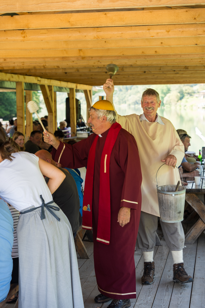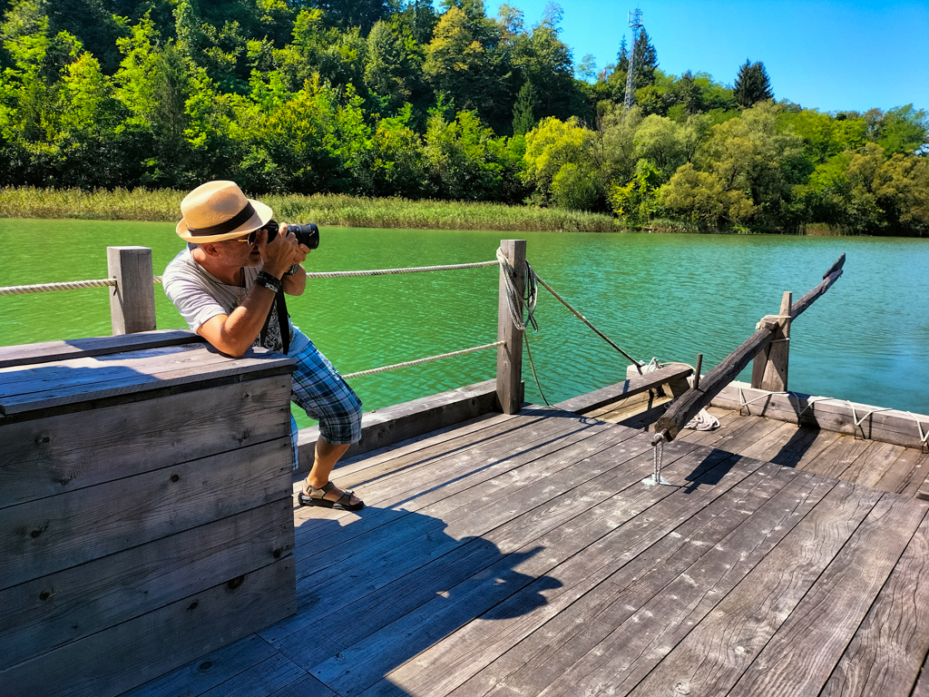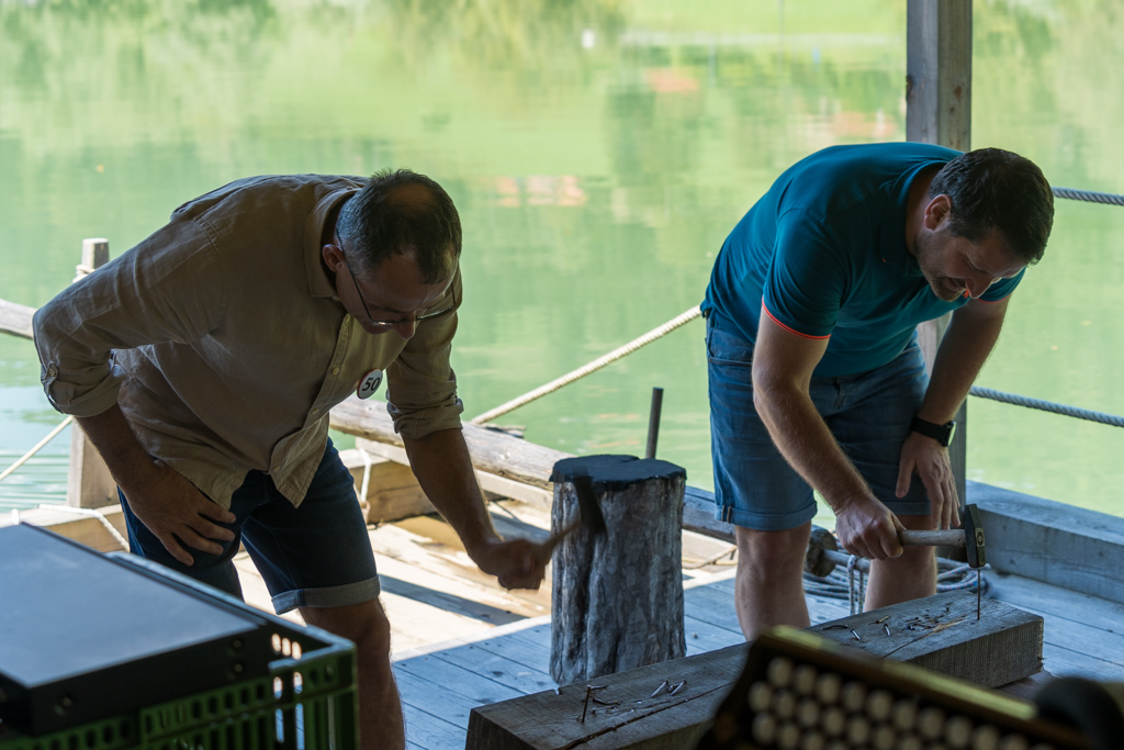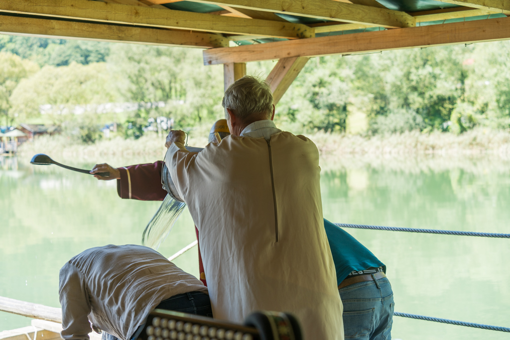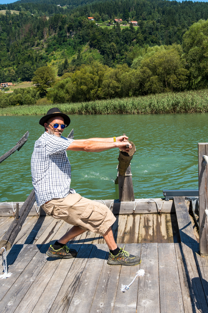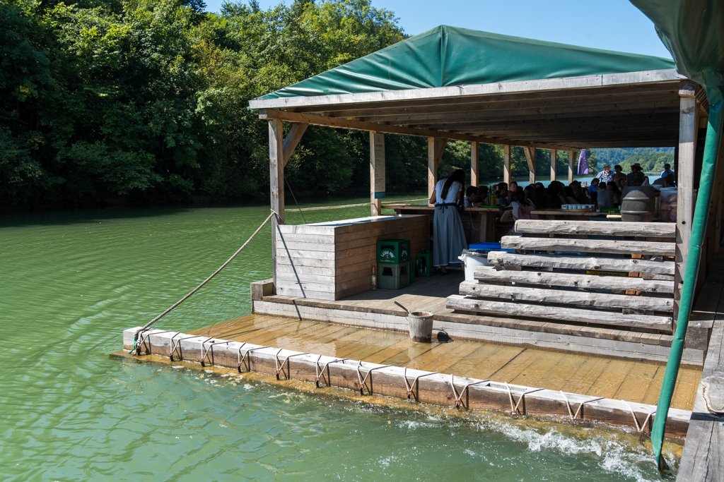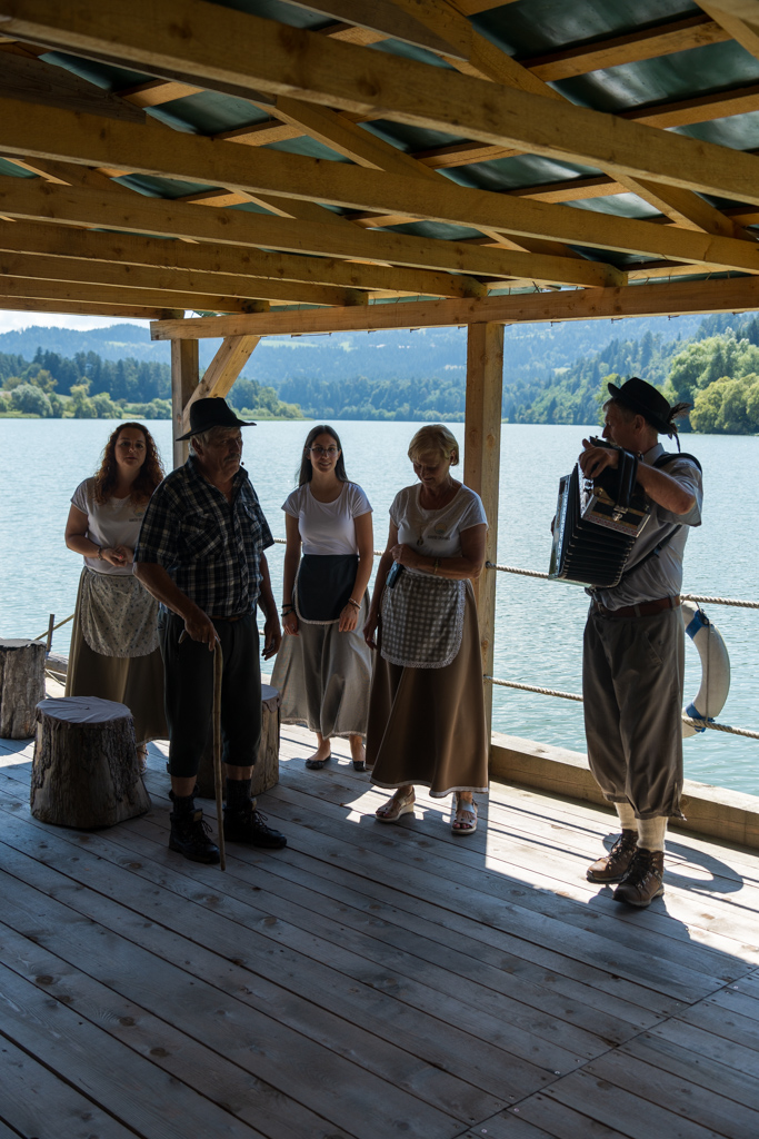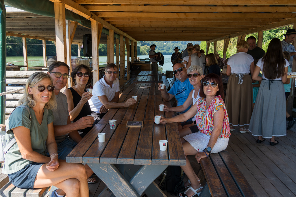 Während der Fahrt erzählt die Crew des Floßes von der Geschichte der Flößerei, von den Herausforderungen, denen die Flößer einst gegenüberstanden, und von den Bräuchen, die mit diesem Handwerk verbunden sind. Einen der Bräuche lernen wir auch kennen: die Flößertaufe. Immer wieder spielen die Musiker auf, und zwischendurch gibt es Geschichten und Infos. Wir erfahren, wie das Holz geschlagen und zu Flößen gebunden wurde, wie die Flößer durch die Stromschnellen navigierten und welche Gefahren sie auf ihren Reisen meistern mussten. Und wie die Flößer, die gut bezahlt wurden, auf der Heimreise ihre sauer verdiente Heuer verprassten. Obwohl das meiste auf Slowenisch ist, verstehen wir viel, vor allem nachdem eine Dame der Crew uns netterweise alles auf Deutsch zusammenfasst.