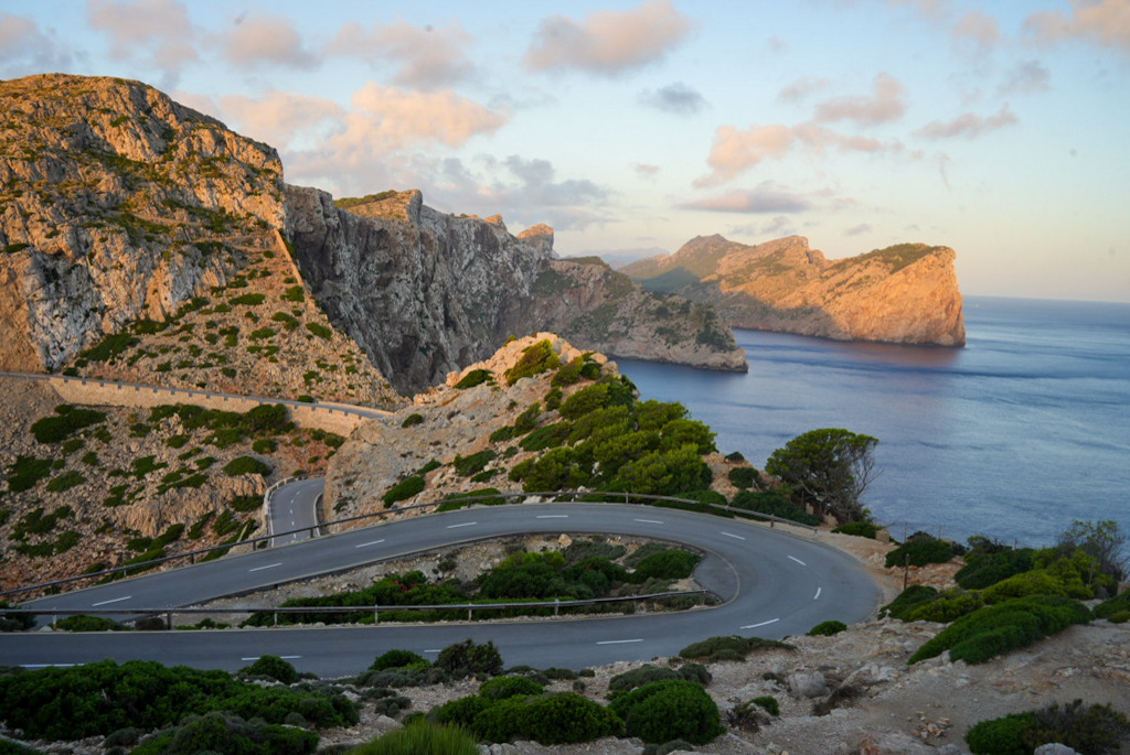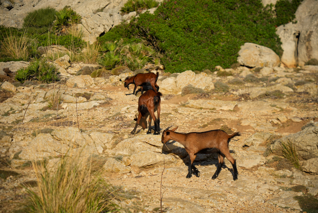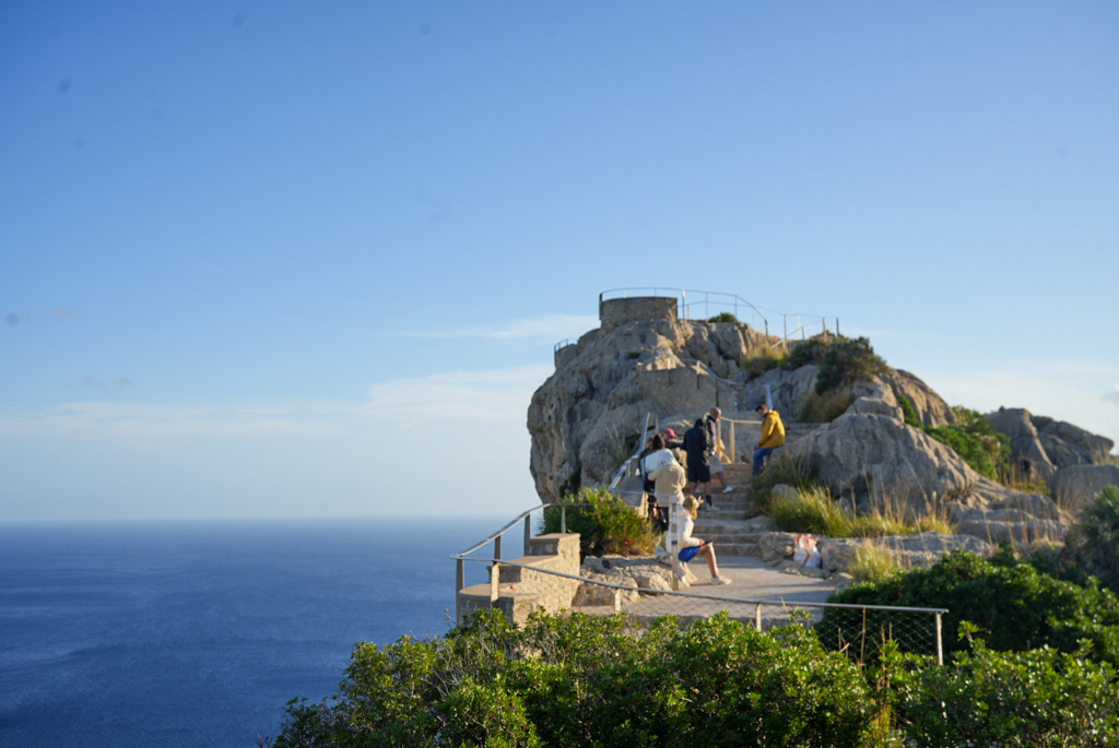 Das Besondere an diesem Aussichtspunkt ist der freistehende Felsen, der wie eine Nadel aus dem Meer ragt – der „Colomer“, was so viel wie Taubenhaus bedeutet. Man kann auf verschiedenen Ebenen klettern, gesichert durch Geländer, und immer wieder neue, spektakuläre Perspektiven entdecken. Es ist jener Moment, in dem man sich winzig klein fühlt vor dieser Wucht der Natur und Schönheit.Auch hier verweilen wir etwas, beobachten ein Fotoshooting und Ziegen, die auf den Felsen klettern, und natürlich die Schönheit der Landschaft. Viele Radfahrer sind zu dieser Zeit unterwegs; immer wieder müssen wir bremsen, weil die Straße zu eng ist, um einfach vorbeizufahren.