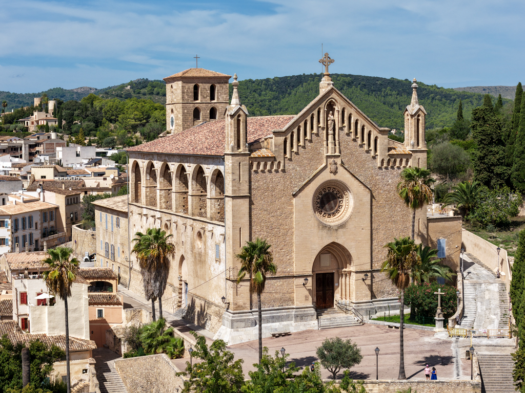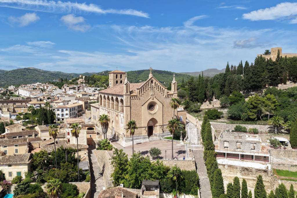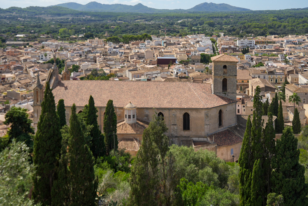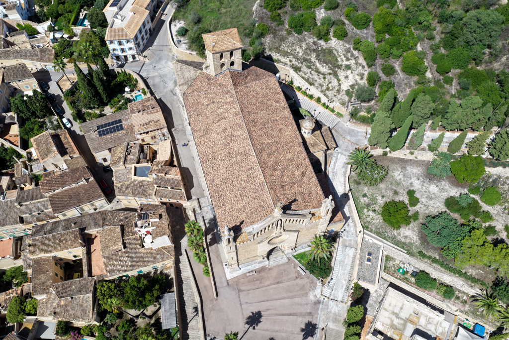 Etwas weiter unten steht die spätgotische Pfarrkirche, deren Bau 1573 begann und bis ins 20. Jahrhundert erweitert wurde. Sie beeindruckt durch ihre Weitläufigkeit, zahlreiche Kapellen und eine prunkvolle mallorquinische Holzkanzel im Hauptschiff. Für die Besichtigung müsste man Eintritt zahlen, zwar nur 2 €, aber wir haben bereits genug Kirchen gesehen. Eine kleine Drohnenaufnahme von außen reicht daher.