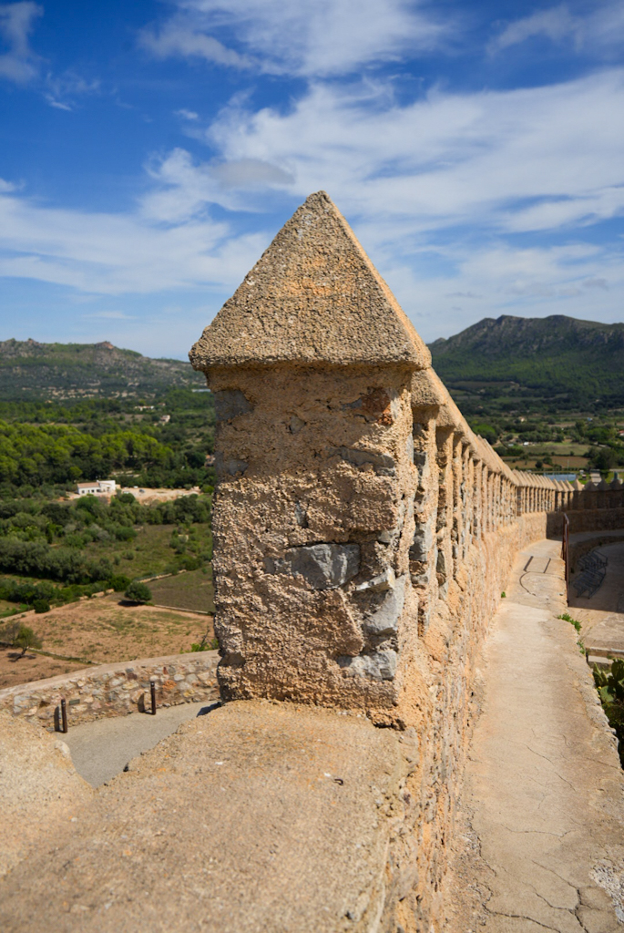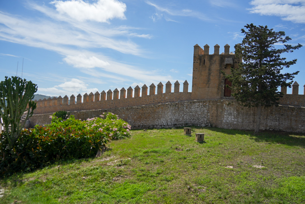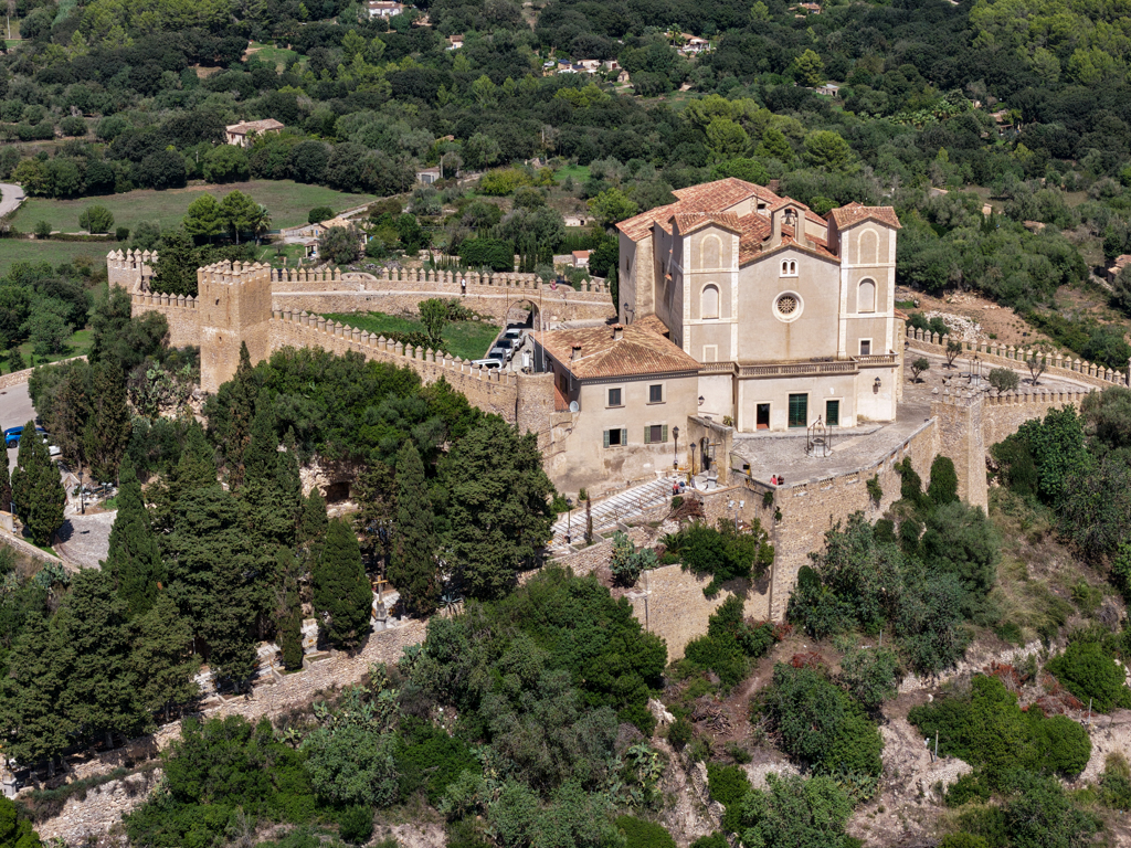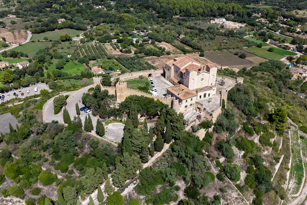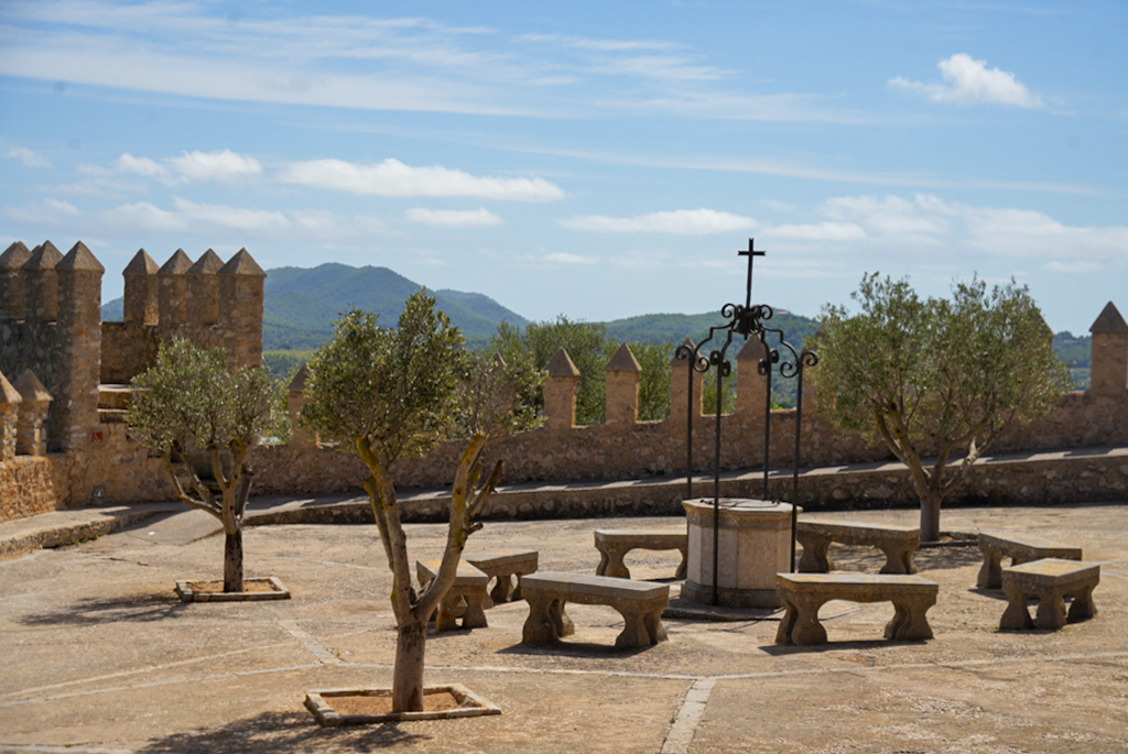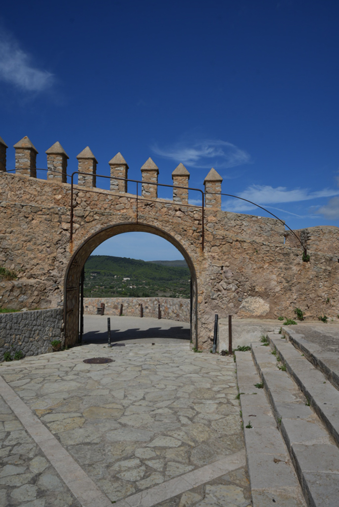 Auf dem Kalvarienberg thront die vollständig erhaltene maurische Burg Almudaina d’Arta, erreichbar über eine zypressengesäumte Treppe. Die Treppe ist jedoch gesperrt, sodass wir die Straße hinauf marschieren müssen. In den Festungsmauern liegt das 14. Jahrhundert‑Wallfahrtskloster Santuari de Sant Salvador. Der Eintritt ist kostenlos, wir können uns frei umsehen – eine wirklich imposante Anlage.