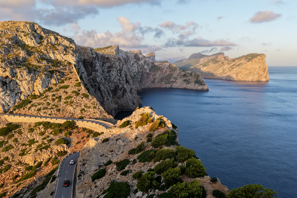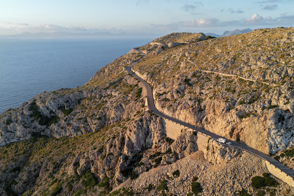 Wir fahren die kurvenreiche Straße vom Cap Formentor zurück und plötzlich eröffnet sich vor uns ein Wahnsinnsblick. Stell dir vor, du stehst auf einer Felsplattform, 200 Meter über dem Meer. Der Wind pfeift dir um die Ohren, und vor dir erstreckt sich eine unglaubliche, raue Klippenlandschaft. Das Meer ist hier nicht nur blau, sondern ein tiefes, leuchtendes Türkis, das man sonst nur aus Filmen kennt. Leider ist es zu windig, um die Drohne steigen zu lassen.