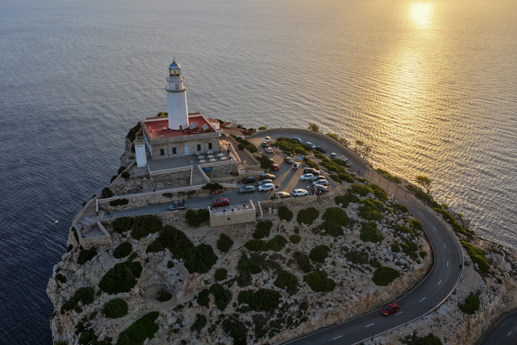 Geographisch liegt der Turm auf dem höchsten Punkt der Halbinsel La Mola, etwa 200 Meter über dem Meeresspiegel. Von dort aus hat man einen weiten Blick über das Mittelmeer, die benachbarten Inseln und das flache Hinterland Formentors. Der Leuchtturm ist heute ein beliebtes Fotomotiv und ein markanter Orientierungspunkt für Segler, bleibt aber ein funktionierendes Navigationshilfsmittel. Trotz des starken Windes gelingen mir einige schöne Impressionen mit der Drohne.