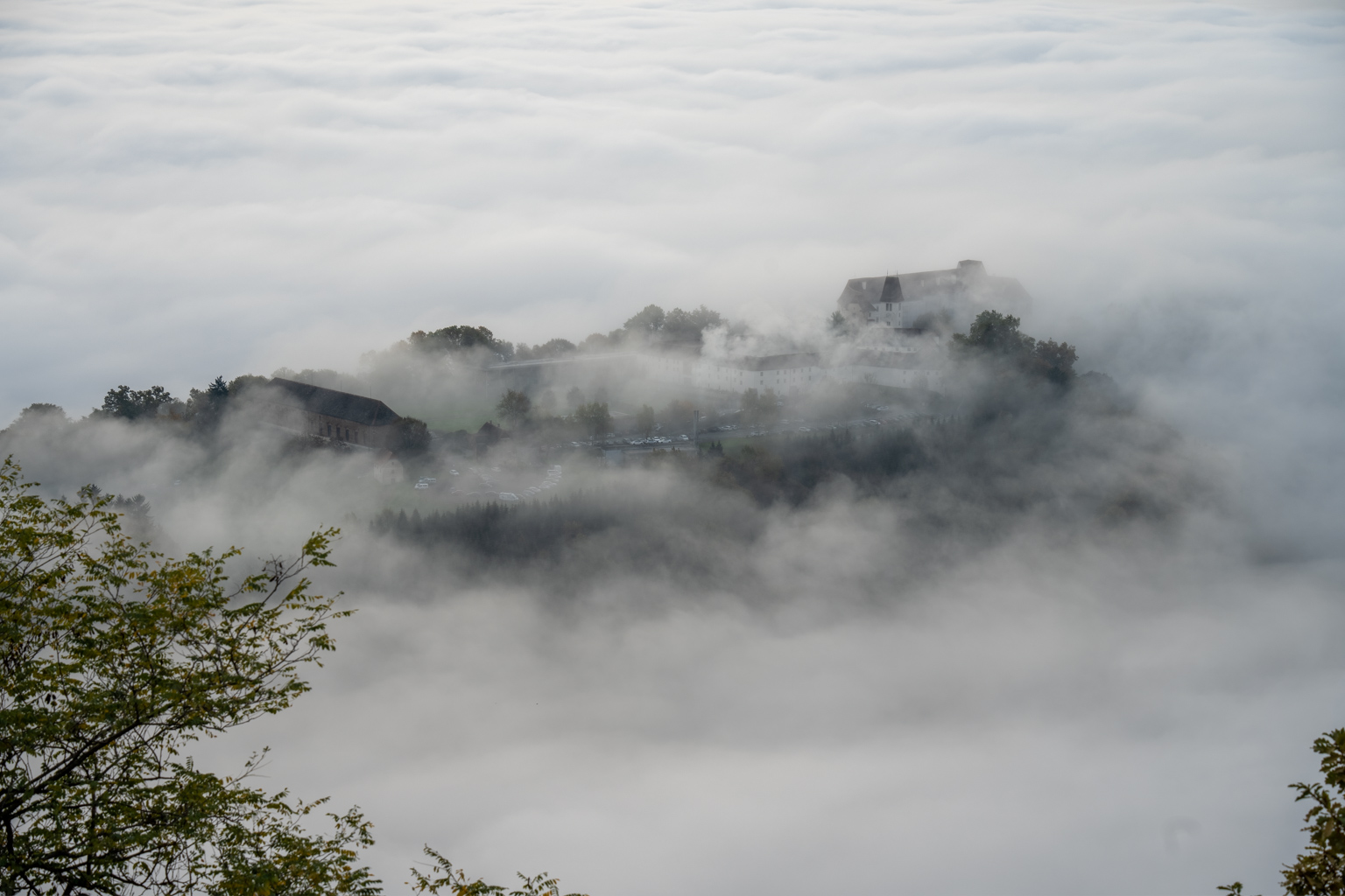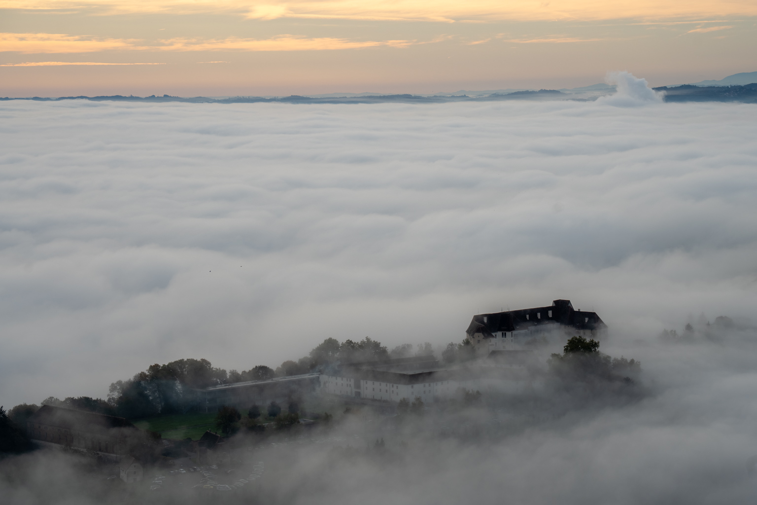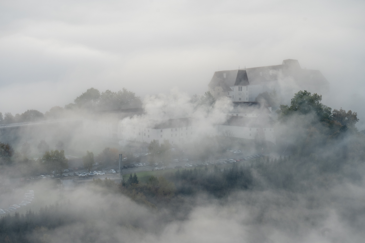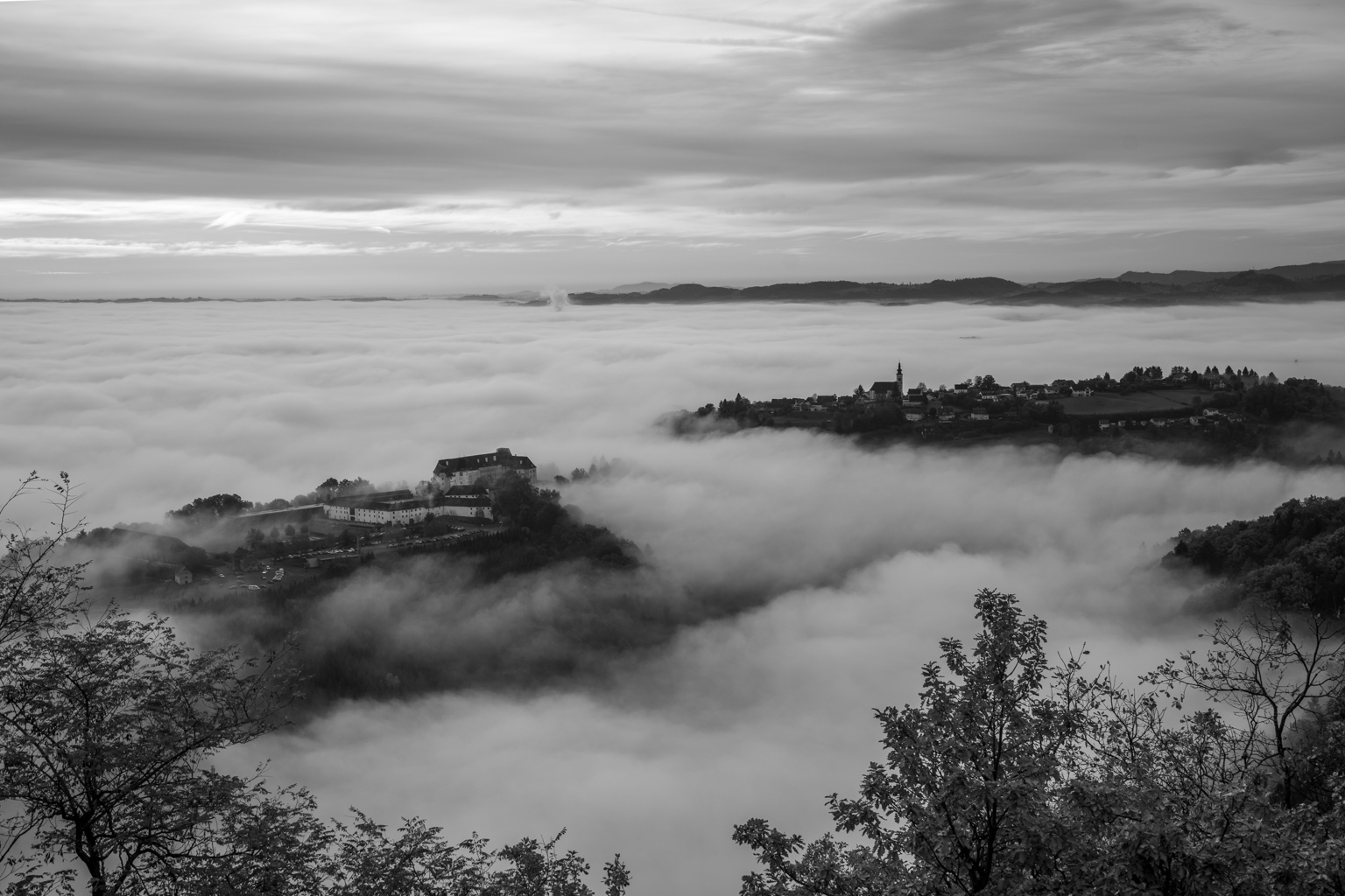 Für die 52 Wochen Foto Challenge stand diese Woche ganz im Zeichen von Monochrom. Eigentlich hatte ich etwas Ausgefalleneres im Sinn, aber der dichte Nebel, der sich heute Morgen wie ein mystisches Tuch über die Landschaft legte, bot eine unverhoffte Gelegenheit. Von Leibnitz aus erhoffte ich mir, die höheren Gebäude der Stadt aus dem Nebel herausragen zu sehen, doch der Schleier war einfach zu dicht. Also machte ich mich auf den Weg zur Kogelbergwarte. Und siehe da, Frauenberg und Schloss Seggau tauchten wie Fata Morganas aus der Nebelsuppe auf. Ein atemberaubendes Panorama, das sich ständig veränderte. Jedes Mal, wenn ich meinen Blick schweifen ließ, bot sich ein neues, faszinierendes Bild.