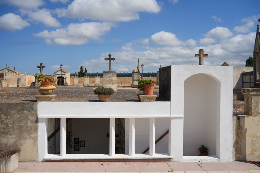 An der Ausfahrt zur Hauptstraße entdecken wir den Dorffriedhof, der sehr interessant aussieht. Die meisten Bestattungen liegen nicht in der Erde, sondern in kleinen, oberirdischen Grüften, oft wie winzige Häuschen oder kunstvolle Mausoleen gebaut. Sie bestehen aus Stein oder Marmor, sind mit kunstvollen Details verziert und liebevoll gepflegt. Jede Gruft erzählt ihre eigene stille Geschichte.