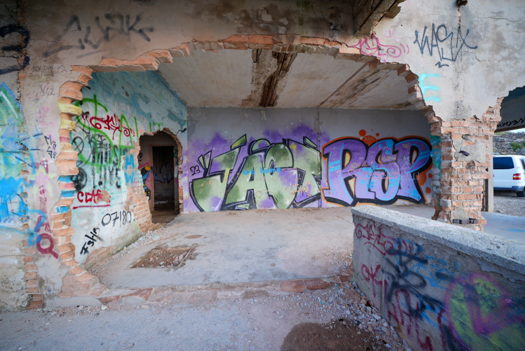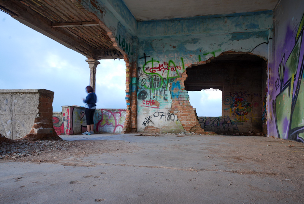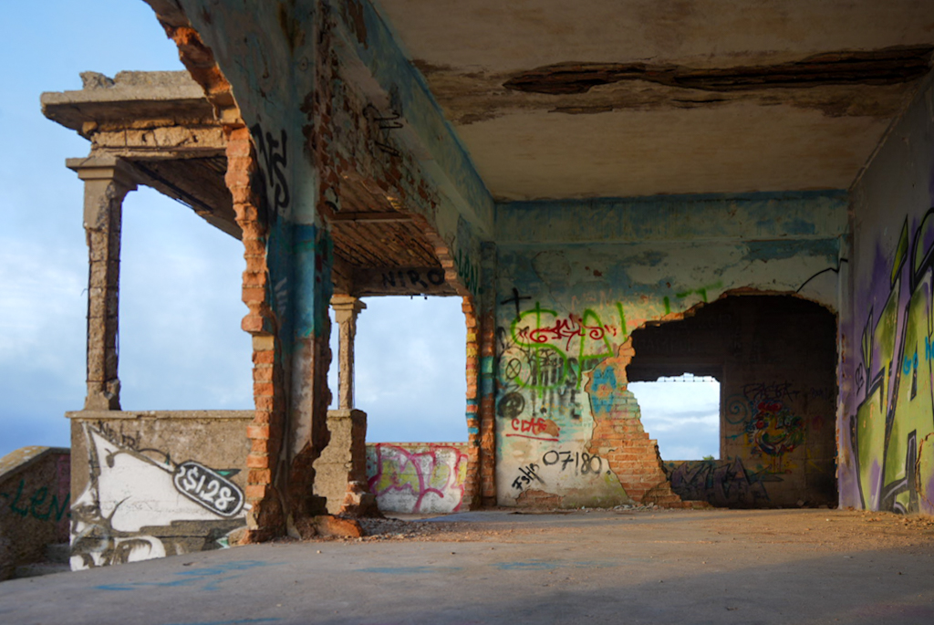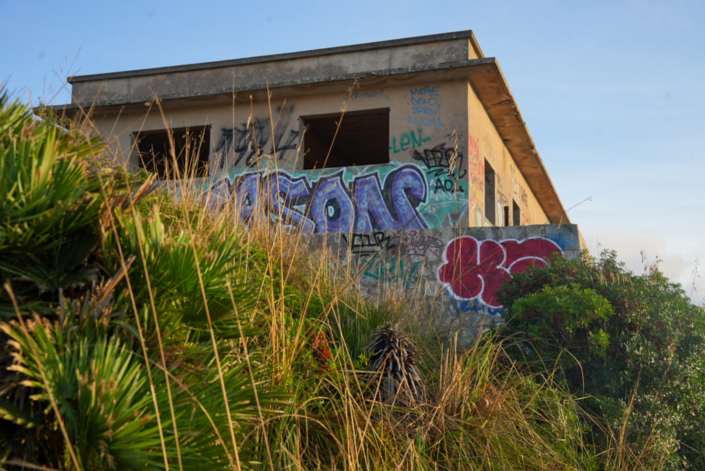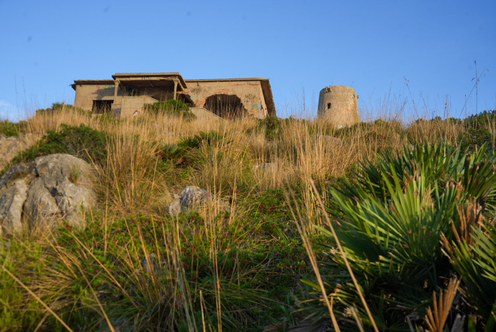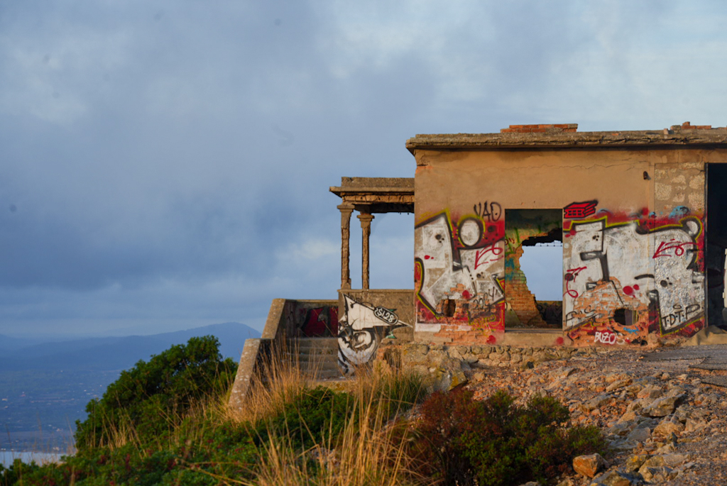 Am Fuße des Hügels stehen einige verlassene Gebäude; wofür sie dienten, habe ich leider nicht herausgefunden. Vermutlich ehemalige Militärbauten – in direkter Umgebung der Talaia liegt eine Anlage des spanischen Militärs, die angrenzende Illa de Formentor ist ebenfalls Militärgebiet, deshalb ist ein Drohnenflug nur mit Sondergenehmigung möglich.