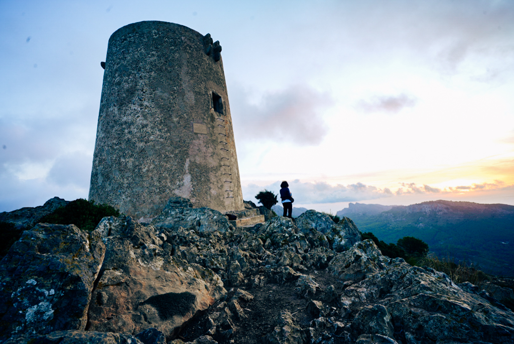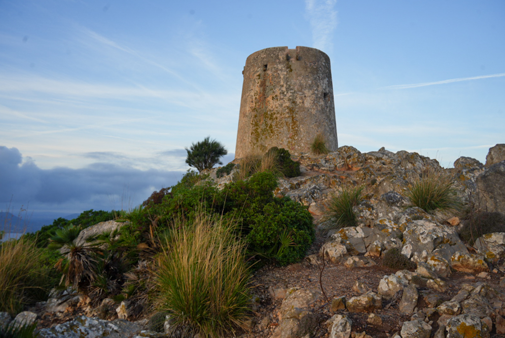 Der Wachturm selbst ist ein uralter Zeitzeuge aus dem 16. Jahrhundert, der einst dazu diente, die Küste vor Piraten zu schützen. Er thront wie ein stiller Wächter auf über 380 Metern Höhe – ein Moment, in dem man sich fühlt, als stünde man auf dem Dach der Welt.Die 360‑Grad‑Sicht ist der absolute Wahnsinn! Auf der einen Seite blickt man über die steil abfallenden Klippen des Cap Formentor, auf der anderen über die weite Bucht von Pollença und Alcúdia. Die aufgehende Sonne wärmt das Gesicht, der Wind pfeift um die Ohren, und eine unglaubliche Ruhe, die nur ein Ort mit so viel Geschichte besitzen kann, breitet sich aus. Es ist ein wilder, majestätischer Platz, der deutlich macht, wie unberührt Mallorca abseits der Strände sein kann.