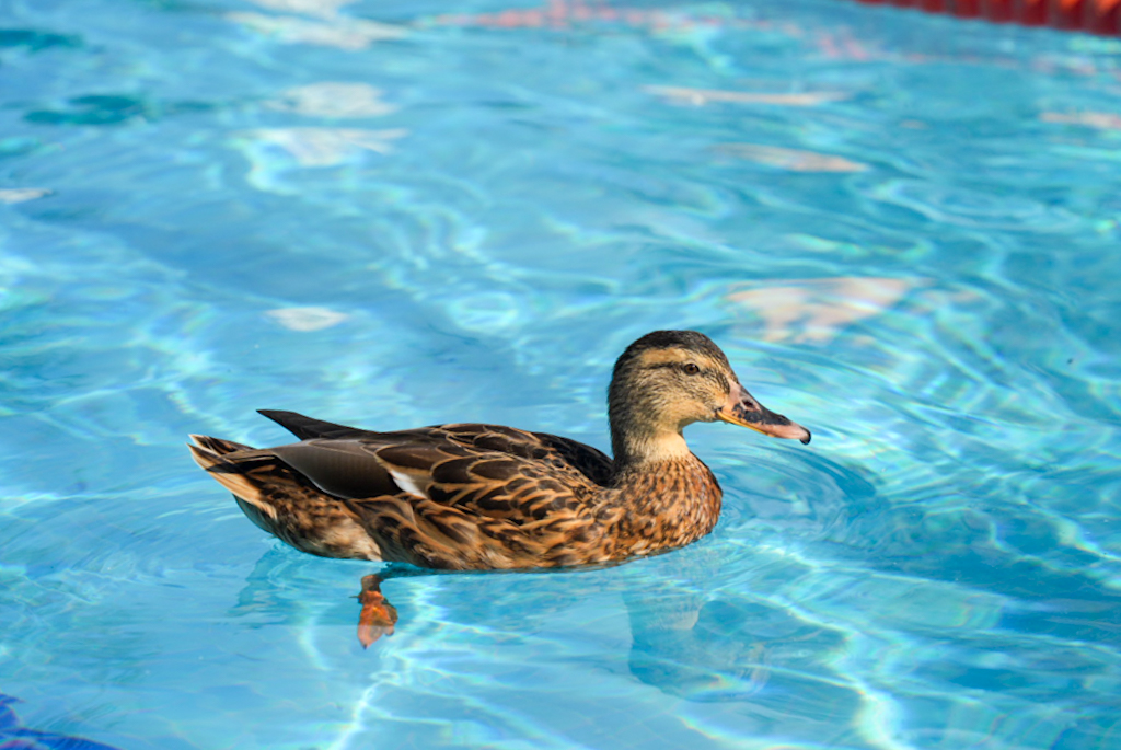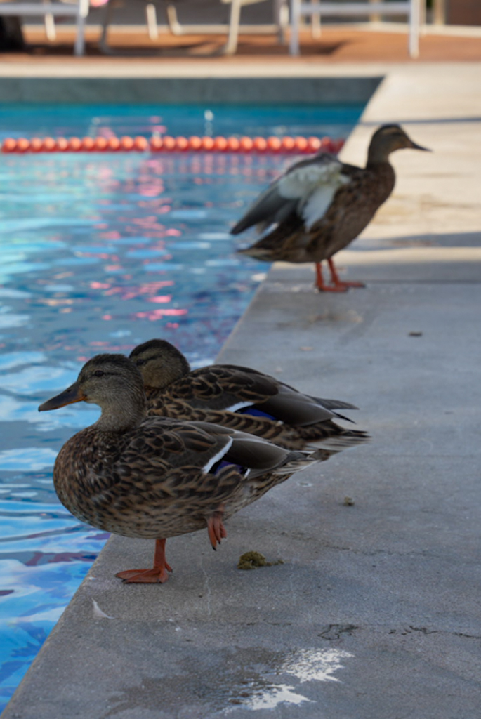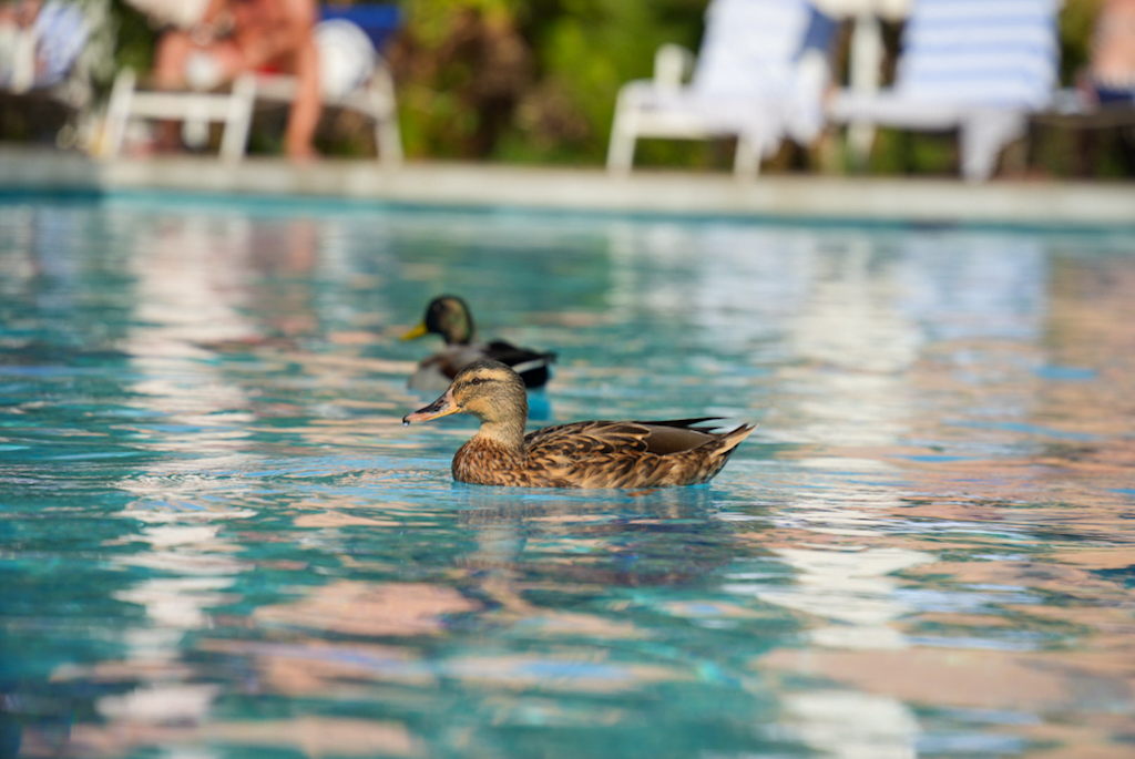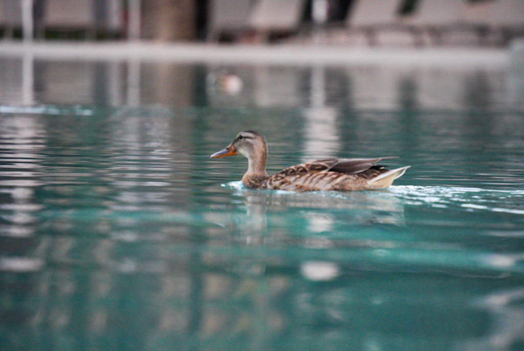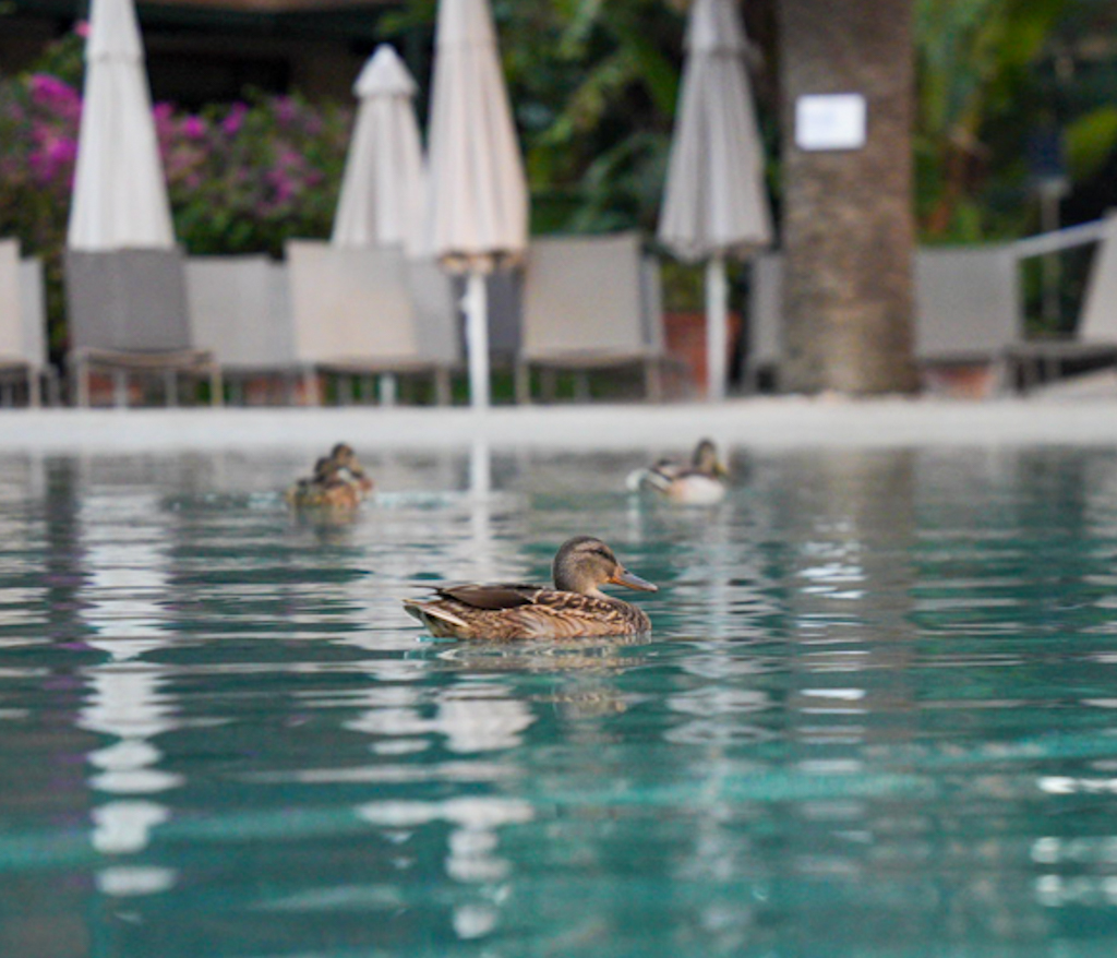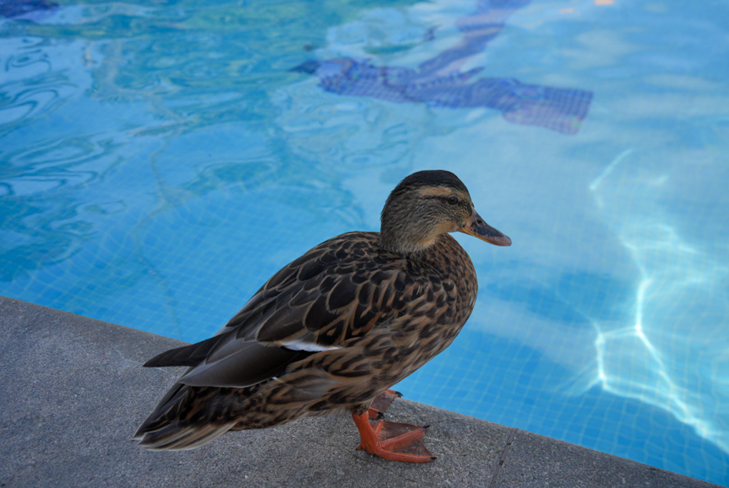 Danach die erste Ente des Tages. Auf der Rückfahrt wollen wir die kleine Halbinsel besuchen, die wir von oben gesehen haben; die Zufahrt zur Insel ist jedoch gesperrt, also zurück zum Hotel. Wie versprochen fotografiere ich die Enten im Pool – sie hinterlassen ziemlich viel Dreck. Am Abend waren wir dann gemeinsam mit den Enten schwimmen und schauten auf die untergehende Sonne in der Tramontana.
