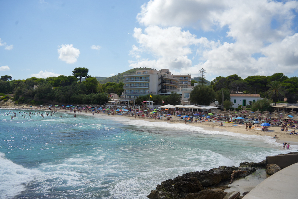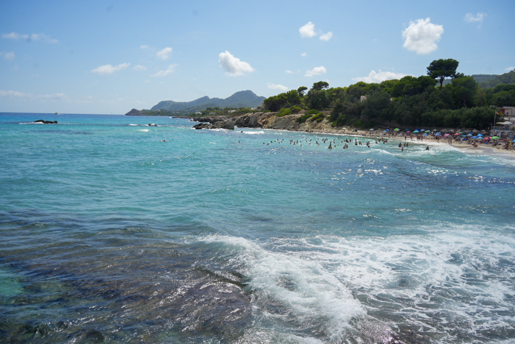 Unser nächstes Ziel, die Cala Mesquida, können wir zwar erreichen, finden aber keinen Parkplatz. Ärgerlich, aber letztlich gut so. Stattdessen fahren wir nach Cala Rajada. Dort finden wir leicht einen Parkplatz und spazieren am Strand entlang. Das Wasser ist türkisblau, die Promenade schön – der Ort gefällt uns, und wir beschließen, am nächsten Tag mit einem San Miguel noch einmal hinzufahren, um etwas zu essen. Also: morgen mehr.