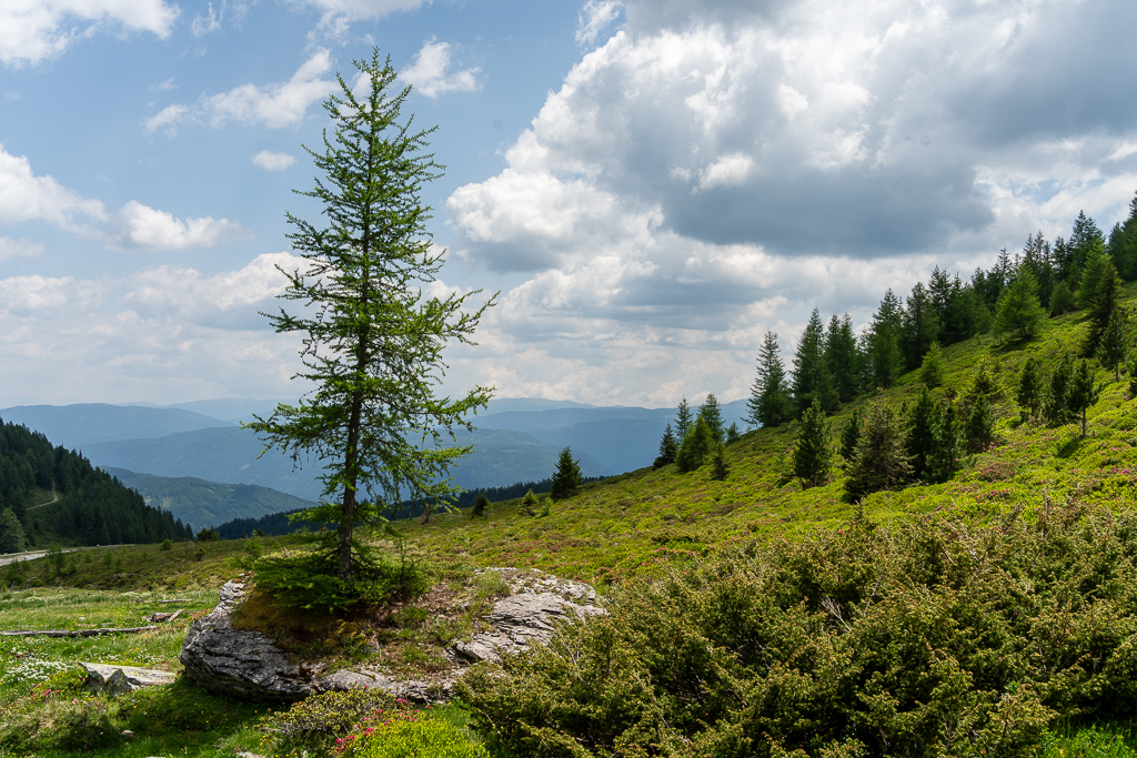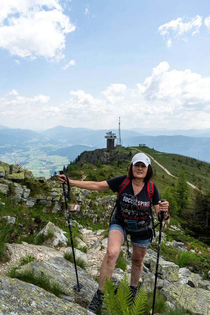 Oben angekommen, eröffnet sich eine völlig neue Welt: das Grosseck selbst! Und der Name hält, was er verspricht – hier ist wirklich alles „groß“. Die Panoramablicke sind einfach atemberaubend! Man blickt weit über die Gipfel der Radstädter Tauern und der Nockberge. Wir stürmen das Gipfelkreuz, was ehrlicherweise recht einfach ist. Bei gutem Wetter ist die Fernsicht gigantisch, und man kann sich kaum sattsehen an diesem 360-Grad-Bergkino. Wir wandern den Grad entlang Richtung Speiereck, teilweise geht es ganz schön steil runter, das Richtige für uns Höhenphopiker. Aber die Luft ist klar und frisch, die Sonne wärmt angenehm, und man fühlt sich einfach frei und unbeschwert. Genau das Richtige, um den Kopf freizubekommen und die Energie der Berge aufzusaugen.