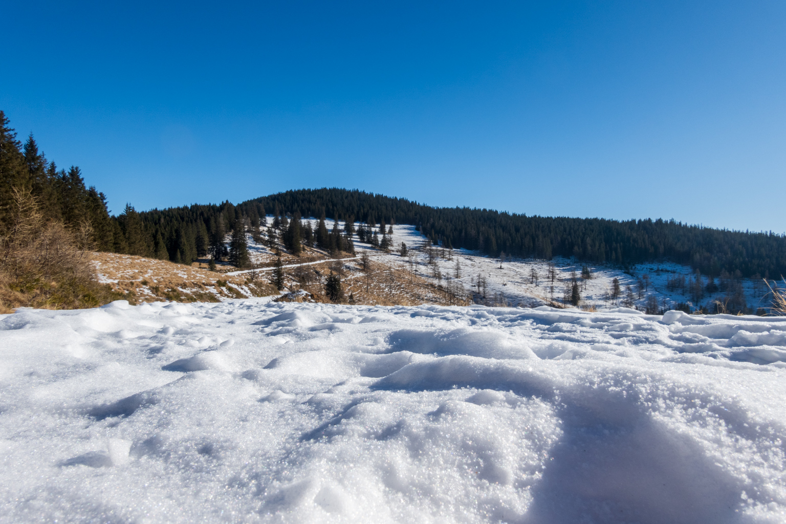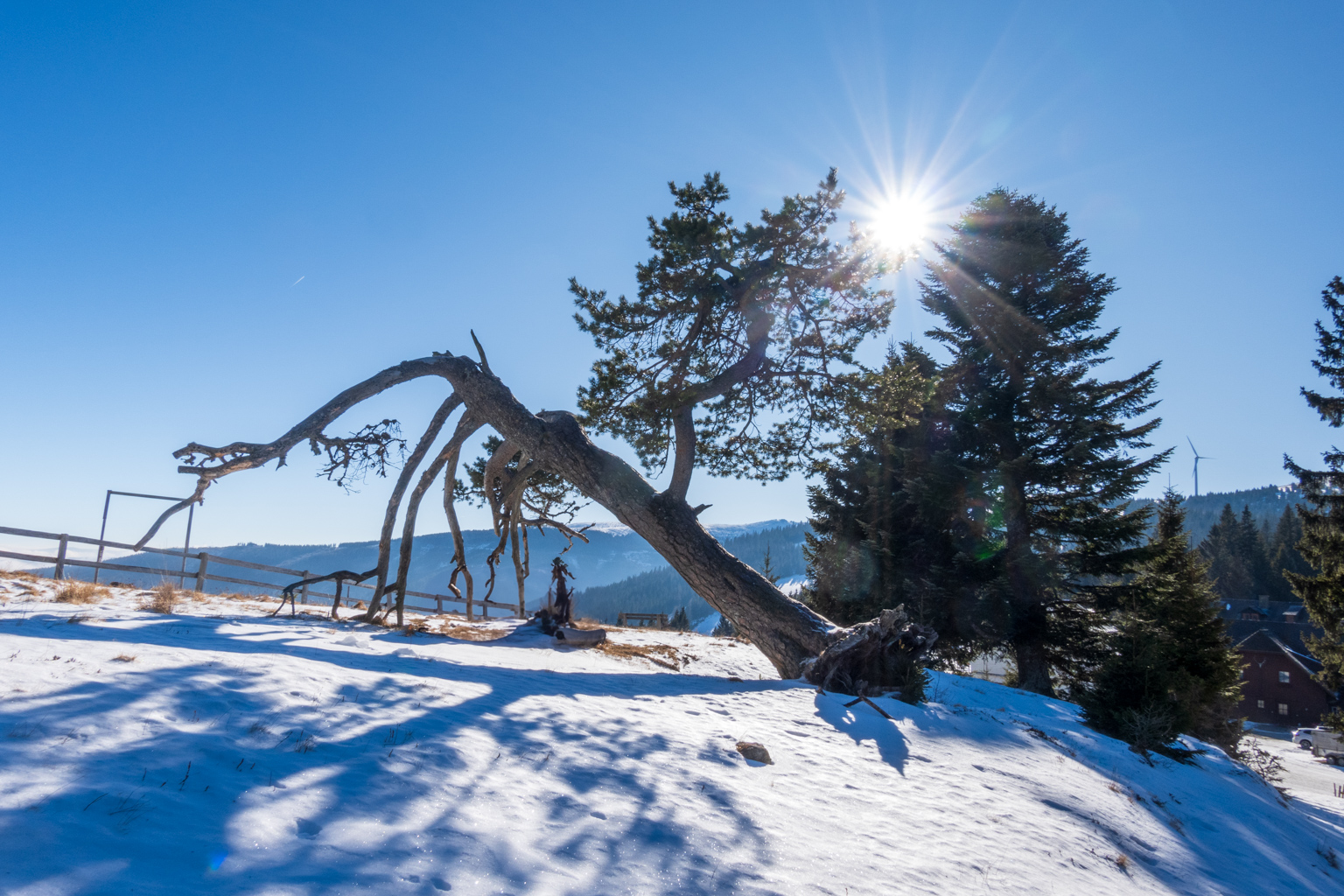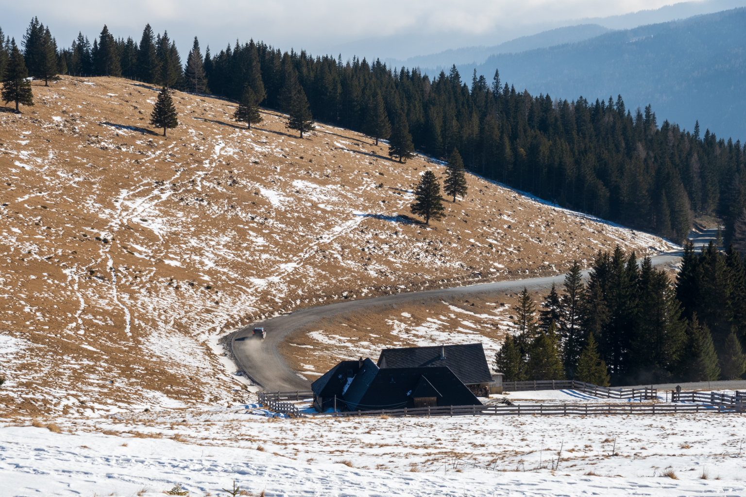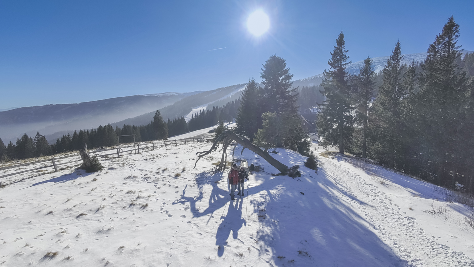 Kurzentschlossen entschieden wir uns am Freitag, zum Gaberl, genauer gesagt zum Alten Almhaus, zu fahren, um etwas Schnee und hoffentlich auch Sonne zu genießen. Kurz vor dem Alten Almhaus ging unser Plan dann auch auf: Wir durchbrachen den Nebel und fanden uns in prächtigem Wetter wieder. Einige Autos parkten bereits, aber es gab noch genügend Platz beim Alten Almhaus, sodass wir problemlos einen Parkplatz fanden.