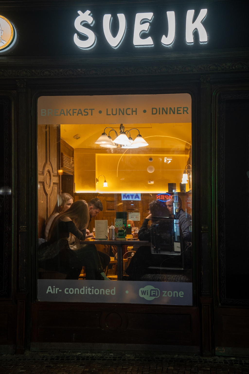 Zum Aufwärmen, bevor es zurück ins Hotel ging, nochmals in ein Lokal, zu einem guten tschechischen Hopfentee :-). Das Lokal mach im ersten Moment einen guten Eindruck, aber das Personal ist sehr skurril, der Kellner will uns beeindrucken, mit seinem Deutsch und als Swejk im Kostüm und Stechschritt. Bevor er einen Kostümwechsel macht und die Zeit 20 Jahre vordreht, verlassen wir das Gasthaus und marschieren zurück ins Hotel.