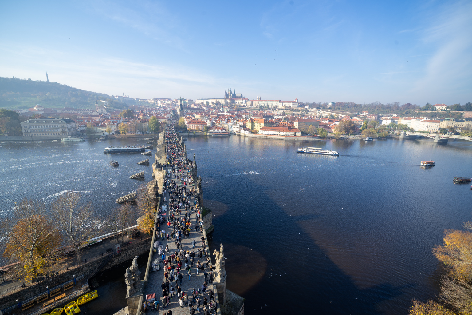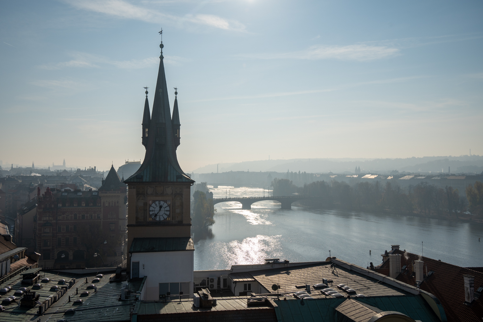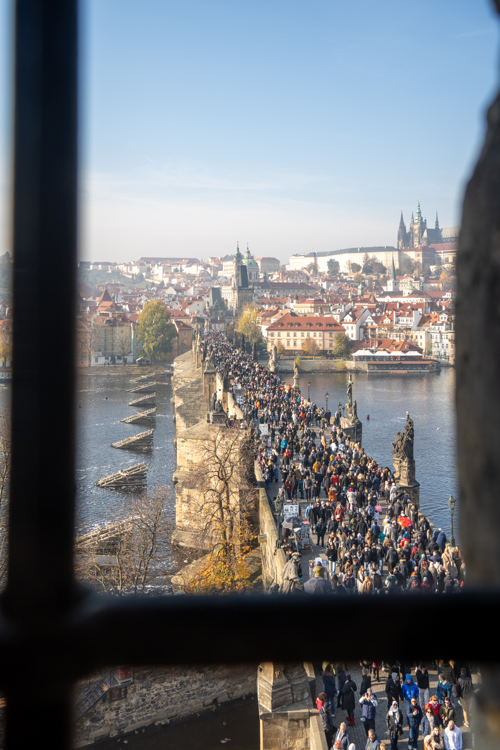 Weiter geht es auf der Karlsbrücke, beziehungsweise über die Karlsbrücke – auf den Altstädter Brückenturm. Hier gibt es eine wahnsinnige tolle Aussicht und nachdem der Himmel aufklart, haben wir vom Aussichtsplattform des Turms, einen atemberaubenden Panoramablick auf die historische Altstadt Prags, die Moldau und die gegenüberliegende Seite.