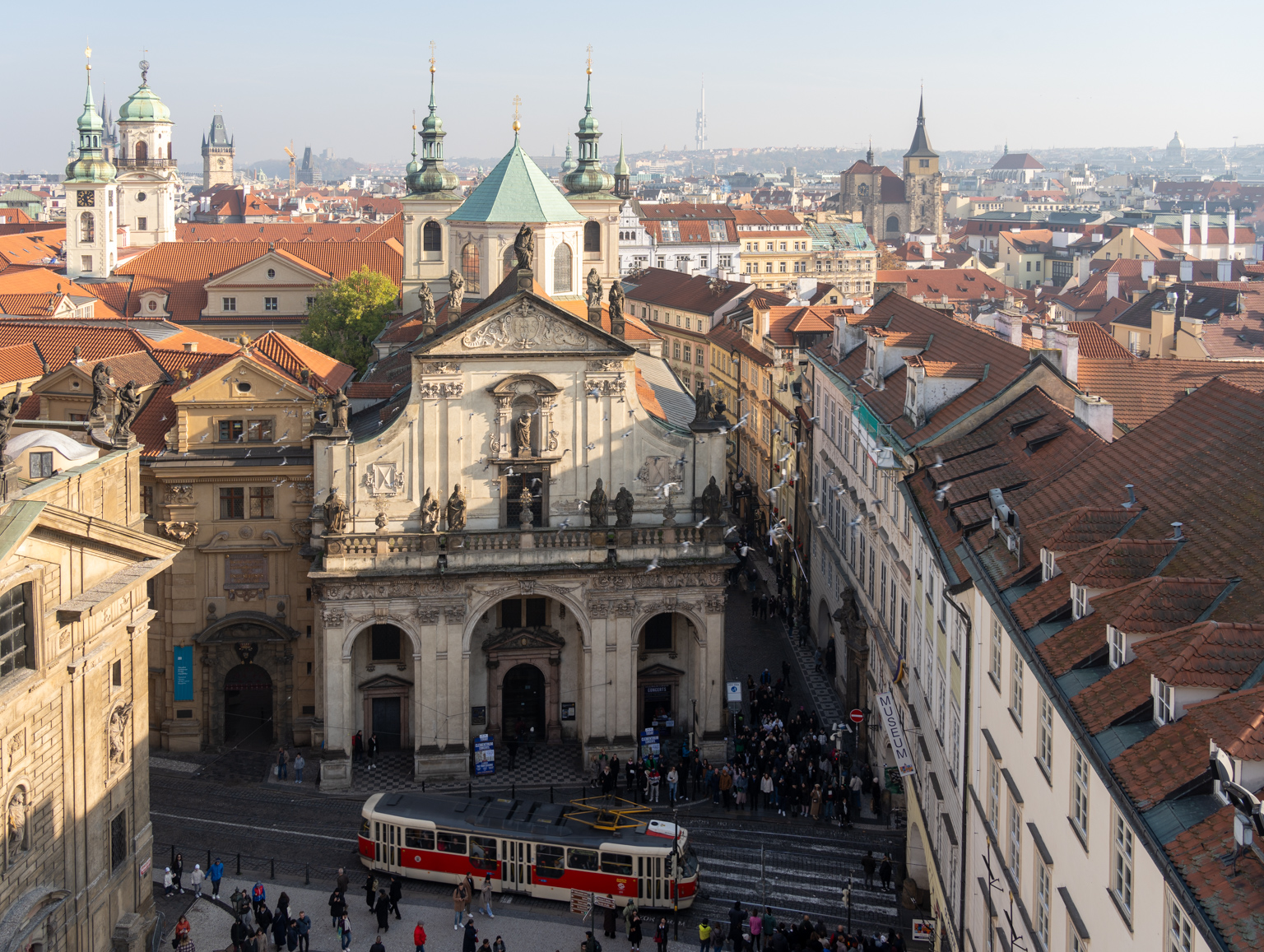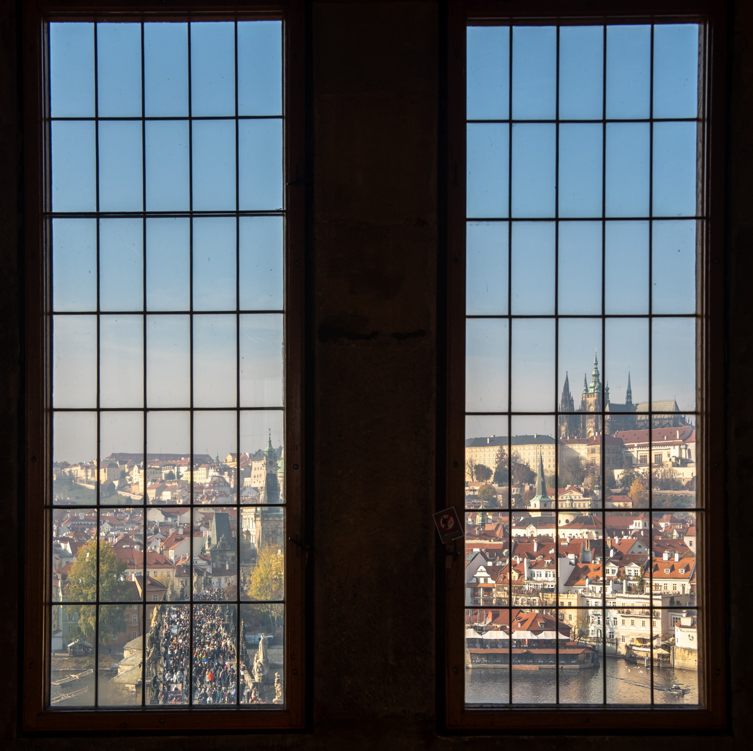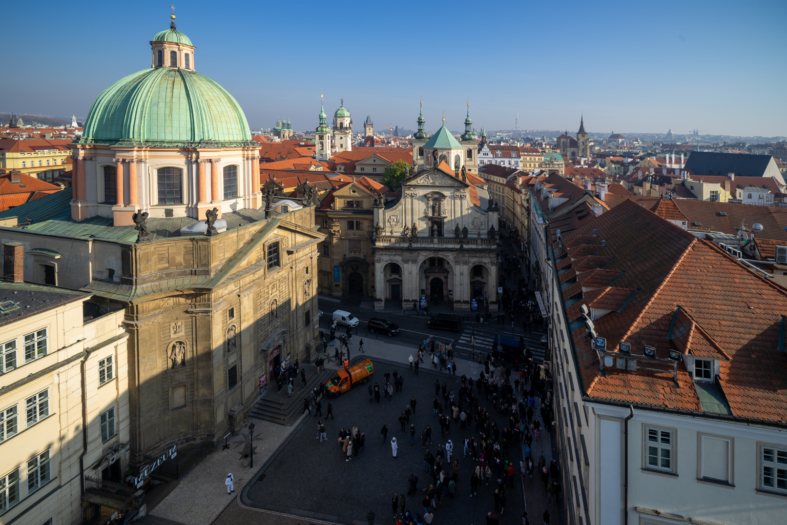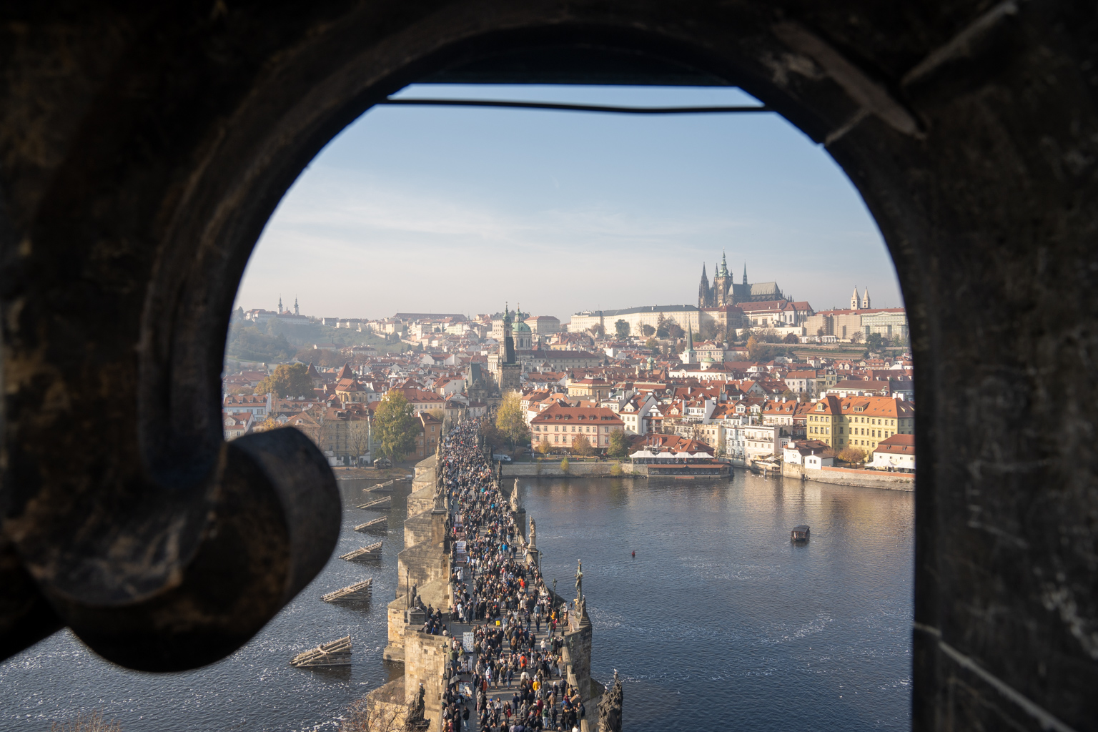 Weiter geht es auf der Karlsbrücke, beziehungsweise über die Karlsbrücke – auf den Altstädter Brückenturm. Hier gibt es eine wahnsinnige tolle Aussicht und nachdem der Himmel aufklart, haben wir vom Aussichtsplattform des Turms, einen atemberaubenden Panoramablick auf die historische Altstadt Prags, die Moldau und die gegenüberliegende Seite.
