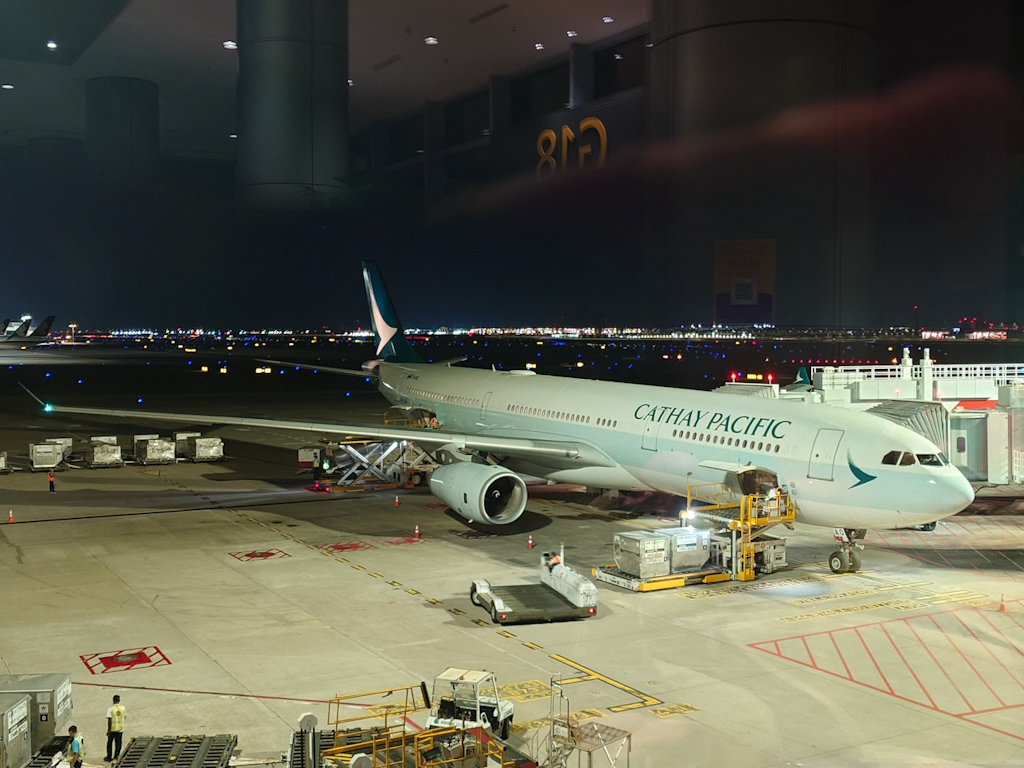 Bei der Sicherheitskontrolle werden sowohl Brigitte als auch ich gefilzt: Brigitte wegen ihrer Euromünzen und ich wegen eines Inbusschlüssels. Dieser wird mir sogar abgenommen – anscheinend hat IKEA das Flugzeug gebaut und sie haben Angst vor der Demontage. Der Flug geht dann mit bisserl Verspätung los und wir fliegen gegen 02:00 Uhr nach Hongkong. Der Snack ist ganz ordentlich und wir versuchen etwas zu schlafen, was aber nicht einfach ist, da der Flieger ziemlich runtergekühlt wird.