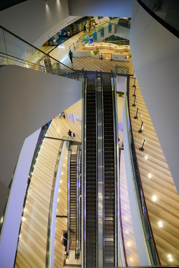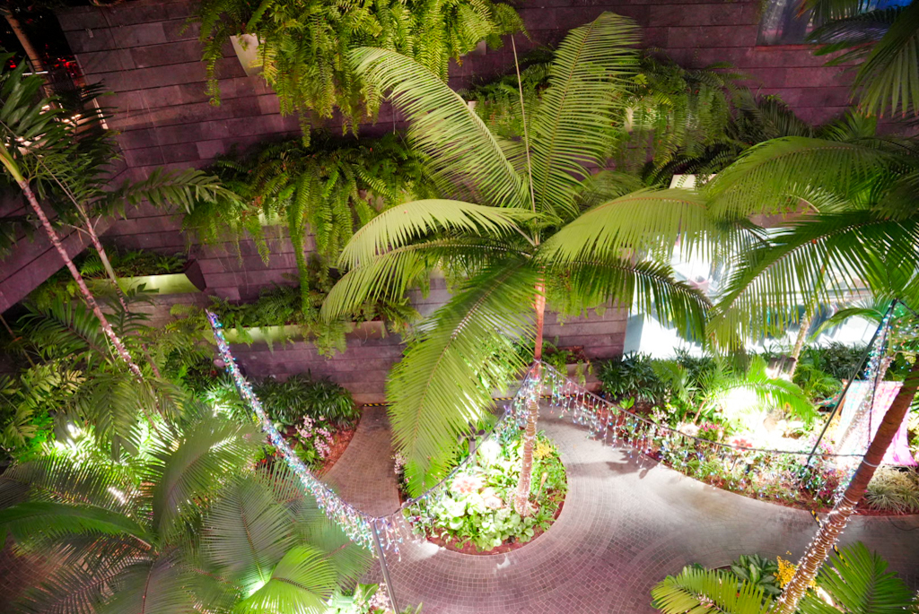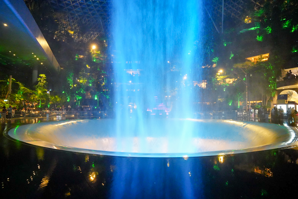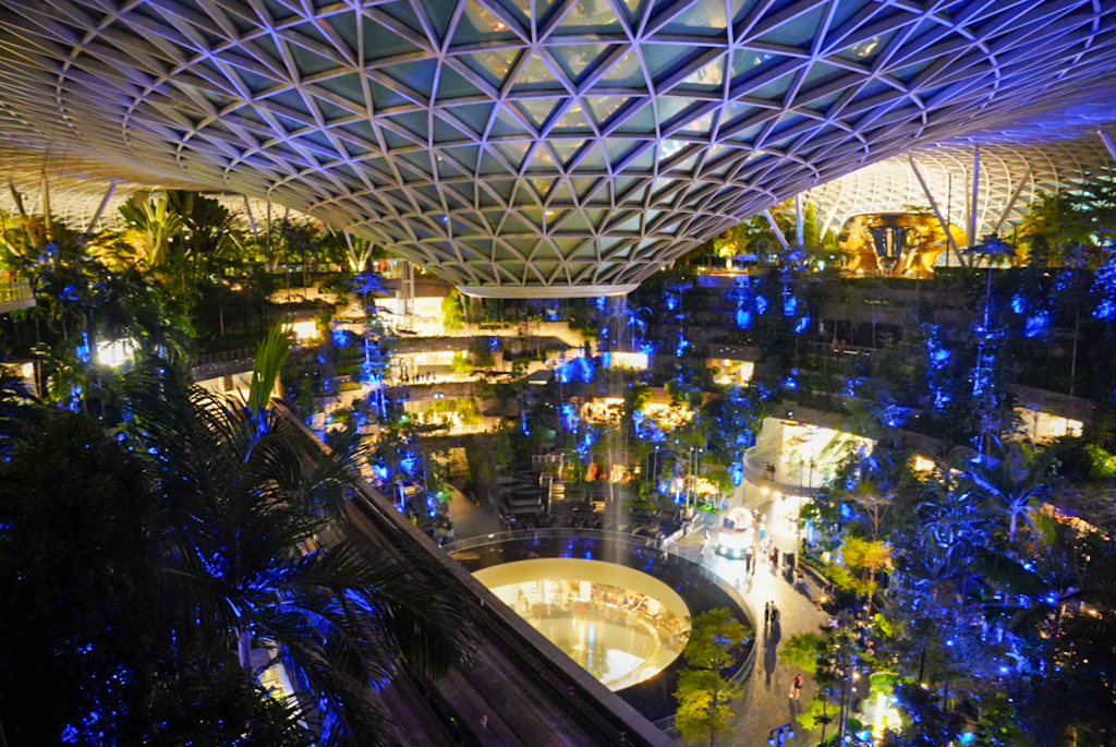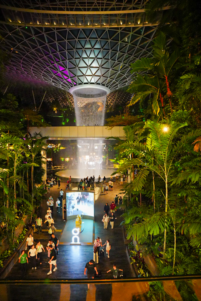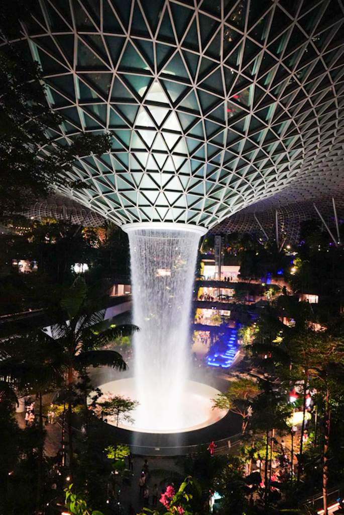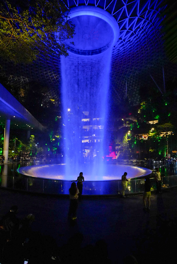 Dann fahren wir doch zum Terminal 1 zum Jewel. Gleich beim Eingang sehen wir den berühmten Indoor-Wasserfall. Der \“Rain Vortex\“ ist mit seinen 40 Metern der höchste Indoor-Wasserfall der Welt und sieht in der modernen Glasarchitektur von Moshe Safdie wirklich gewaltig aus. Aber leider ist das fast alles, was wir sehen, denn um 22:00 Uhr sperrt hier das meiste zu. Von den ganzen Gärten und anderen Sehenswürdigkeiten, die es hier geben soll, sehen wir nicht viel. Wir sind etwas enttäuscht und auf der anderen Seite froh, dass wir nicht früher gefahren sind.
