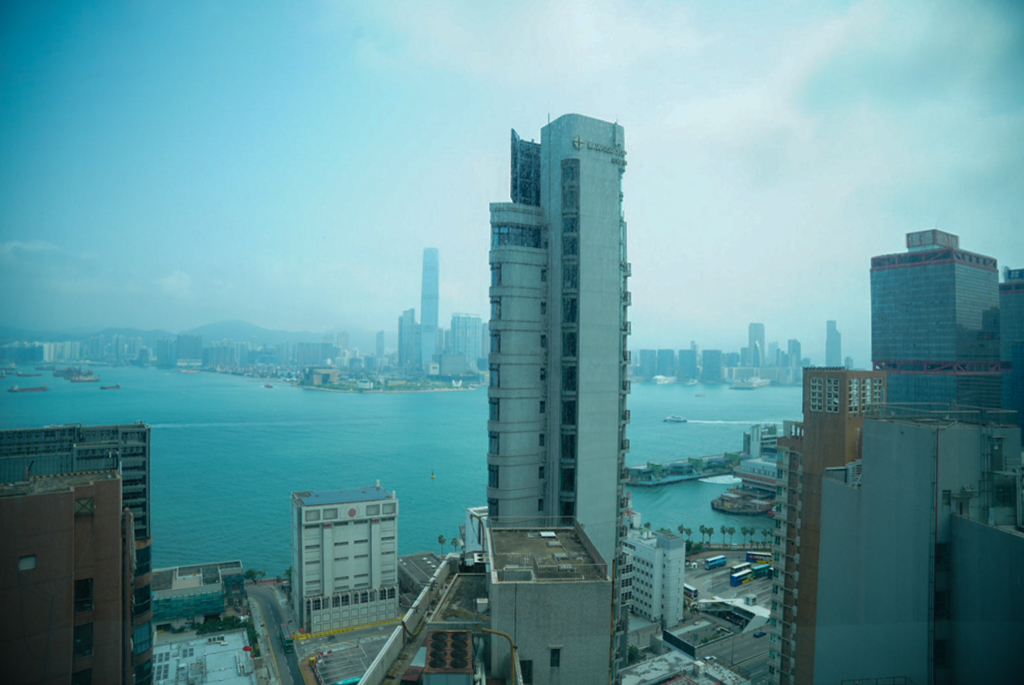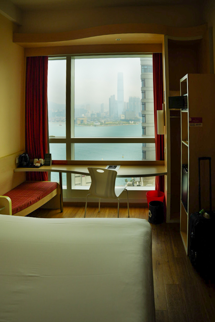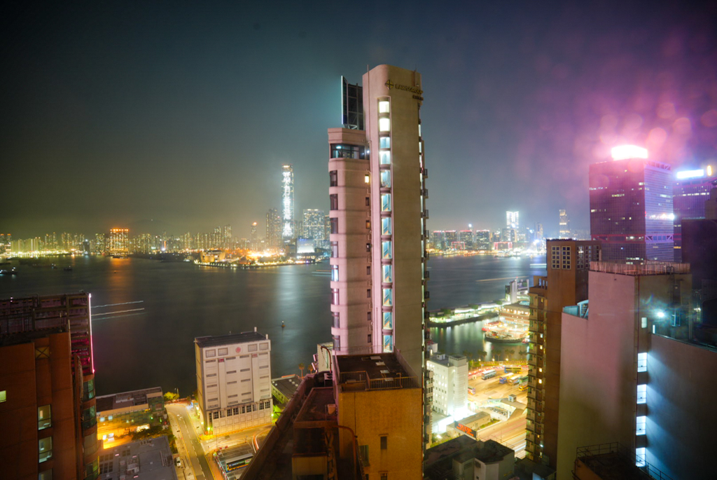 An der Hafenpromenade spazieren wir wieder Richtung Hotel, um dort in der Nähe was zum Essen zu suchen. Leider erwischen wir heute das falsche Lokal – so eine Art Fast Food für Chinesen. Brigitte schmeckt es ganz gut, mir überhaupt nicht. Da wir noch immer nicht ausgeschlafen sind, geht es heute recht früh ins Hotel. Der Blick aus dem Fenster ist genial, obwohl er schwer zu fotografieren ist, da die Scheibe nicht hundertprozentig sauber ist.