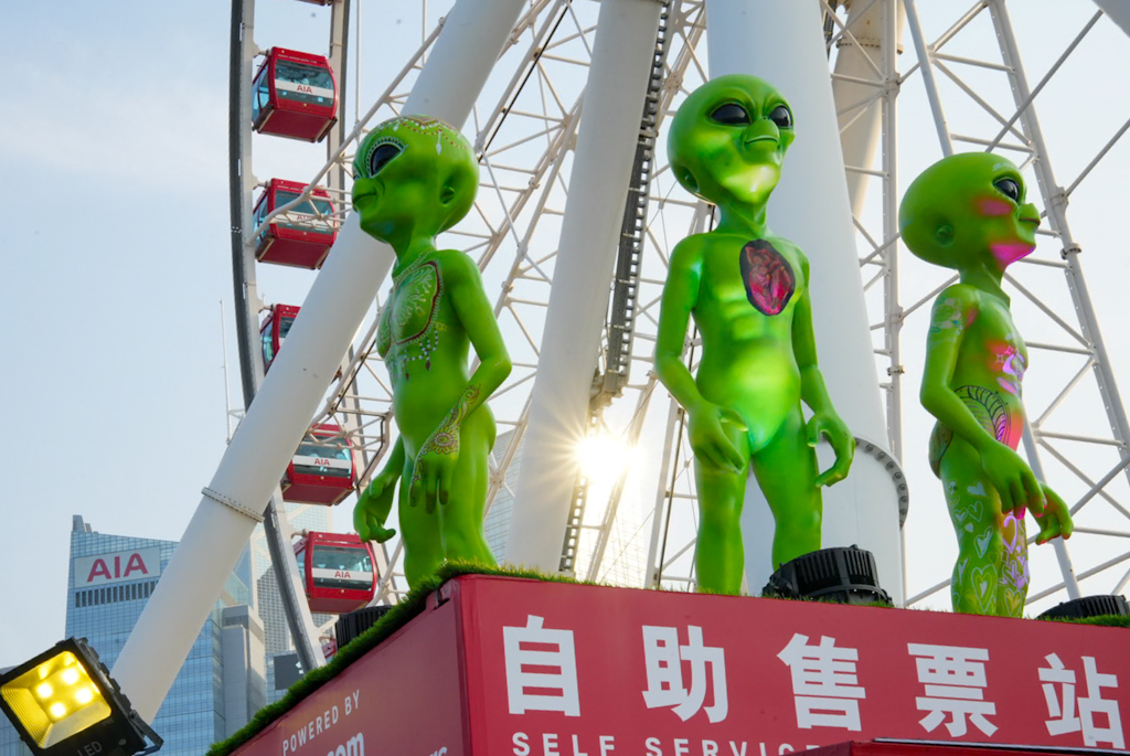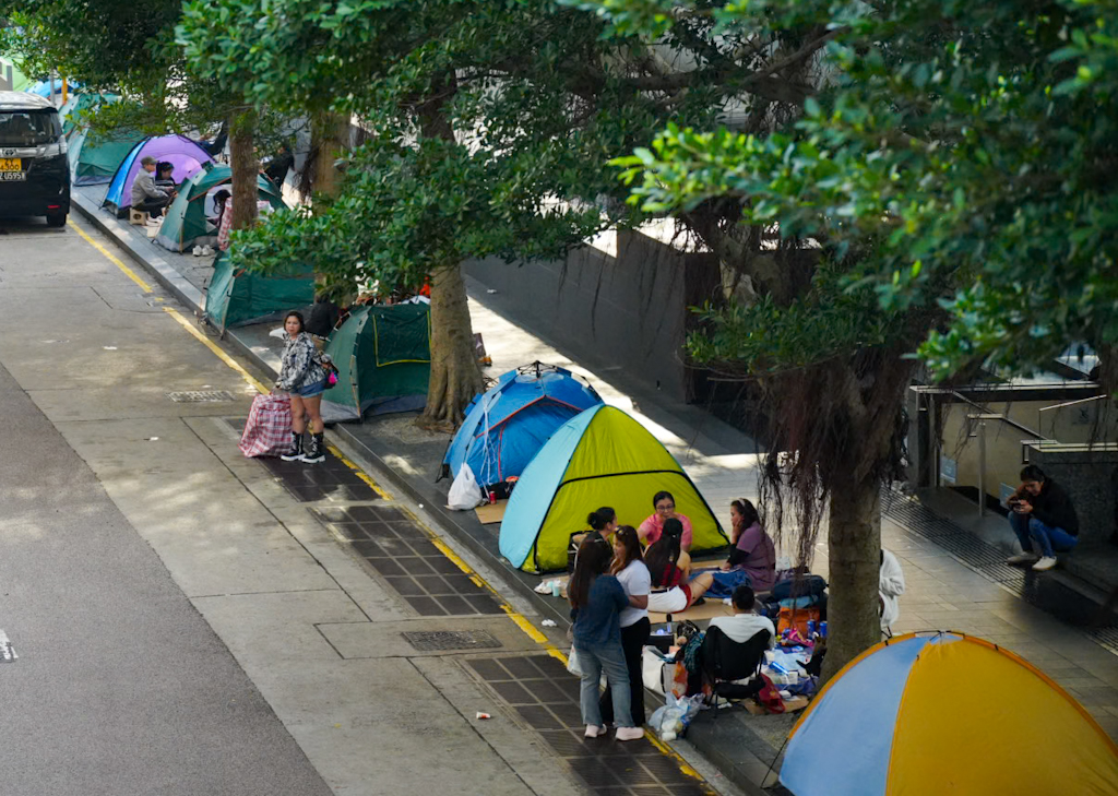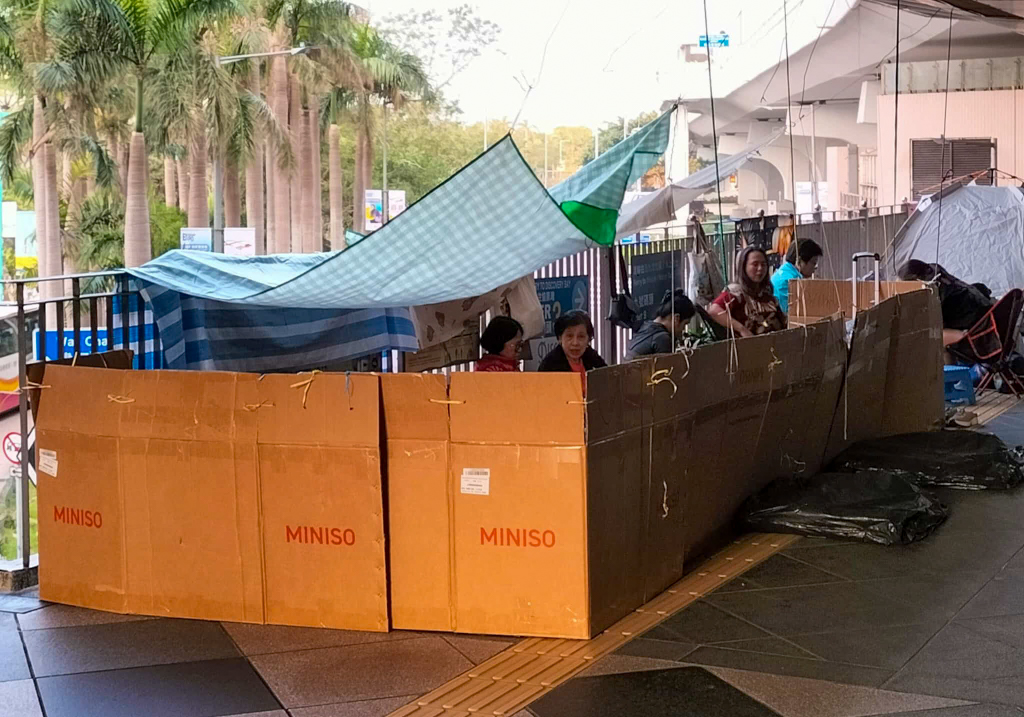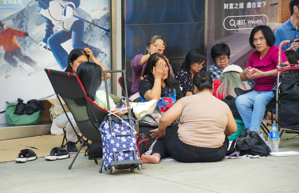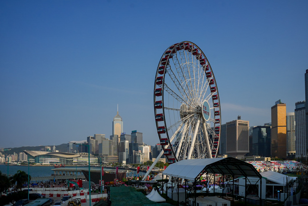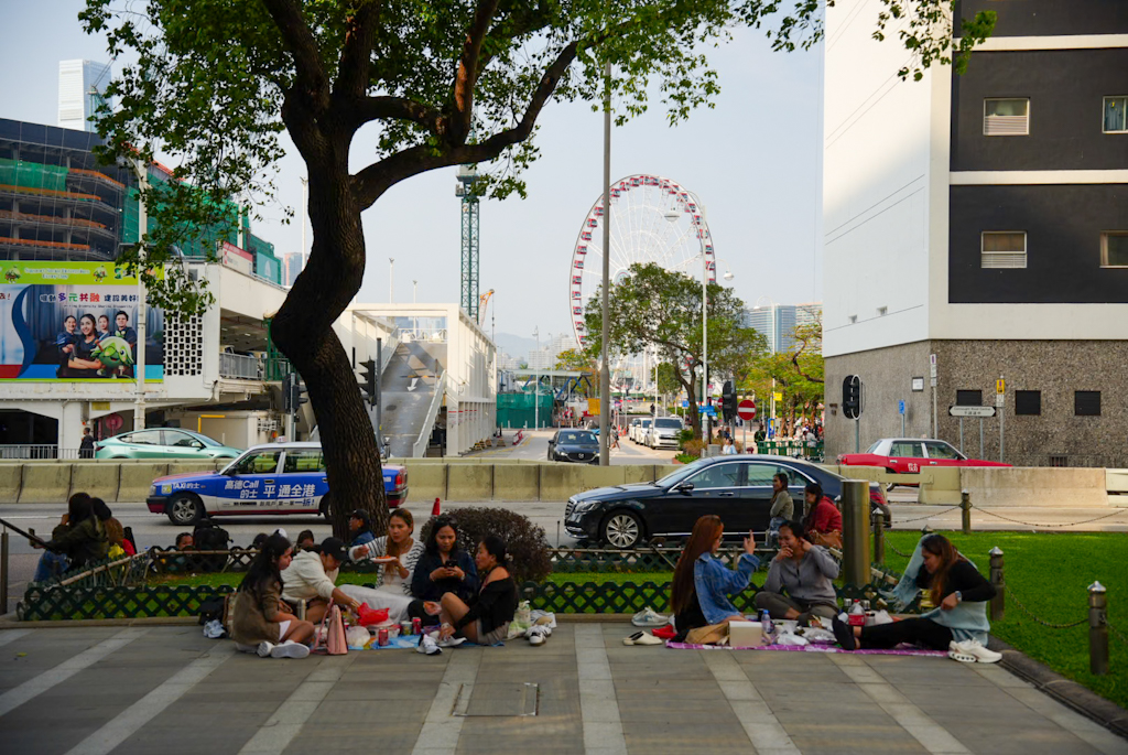 Wir spazieren Richtung Riesenrad -> zum Hong Kong Observation Wheel. 60 Meter hoch am Central Harbourfront und bietet einen Panoramablick auf den Victoria Harbour und die Skyline der Stadt. Es befindet sich im AIA Vitality Park. Überall auf der Straße sehen wir Leute, die auf Kartons sitzen oder in Zelten hocken. Zuerst denken wir an Obdachlose, aber es sind anscheinend Familien oder Freunde (oft Haushaltshilfen an ihrem freien Sonntag), die auf der Straße feiern, Karten spielen, Karaoke singen oder sogar Fußpflege machen.