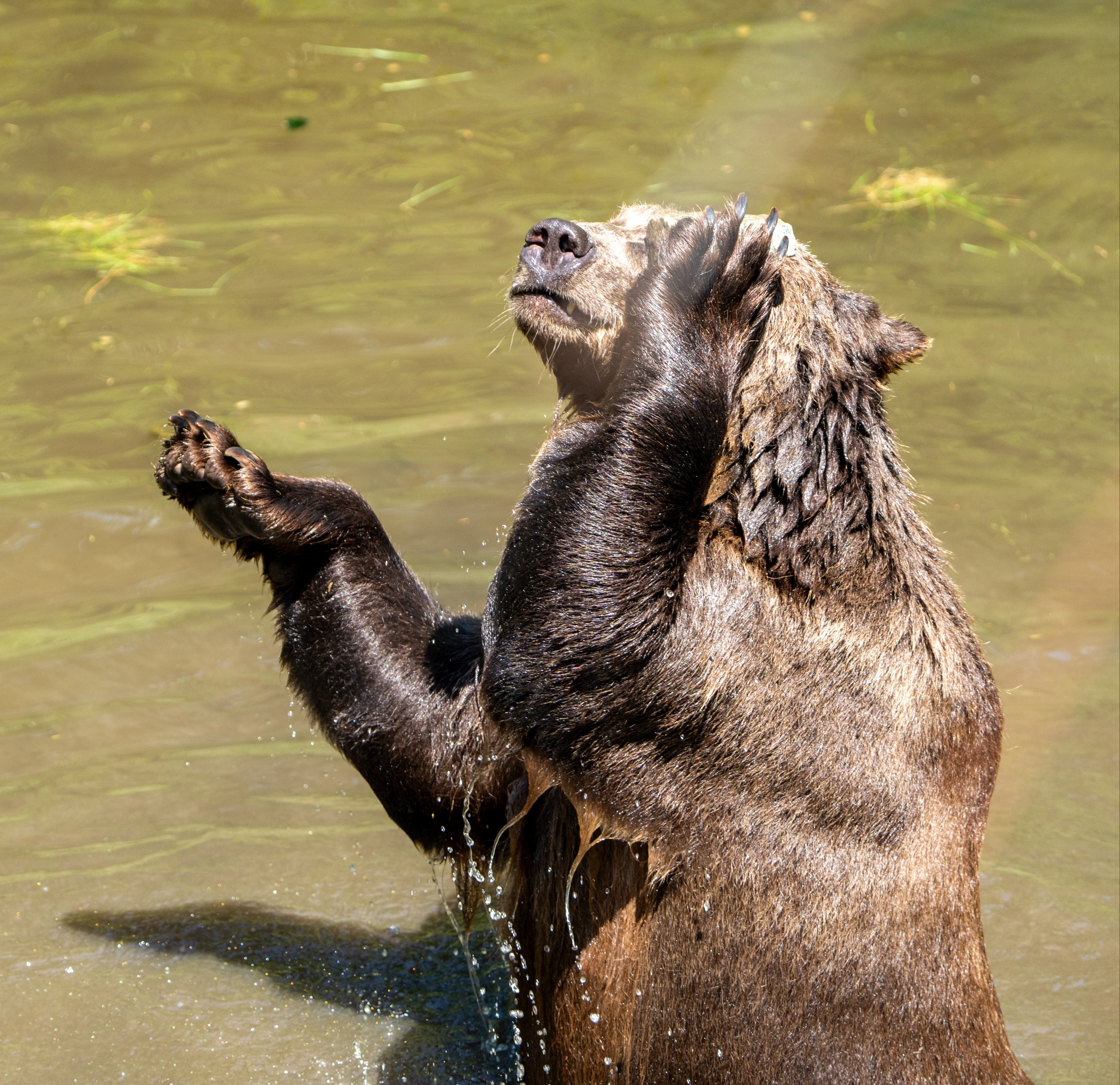 Mit dem Sessellift geht es zum Berg. Leider haben wir eine blöde Zeit erwischt, während die Besucher in der Sonne schwitzen, verkriechen und verstecken sich die Tiere. Luchs und Wildkatze sehen wir nur auf den Fotos. Beim Bärengehege sehen wir dann das erste Mal etwas, 2 Wölfe und ein Bär. Im Steinwildgehege einen Steinbock und einige Geißen und Zicklein. Am Rückweg kommen wir nochmals am Bärengehege vorbei, jetzt spielt ein Bär im Wasser mit Stöcken und Steinen, witzig anzusehen. Das war es aber leider, man sieht zwar einen Polarwolf, Timberwolf, Bison und Yaks, aber diese entweder schlafend oder weit weg.