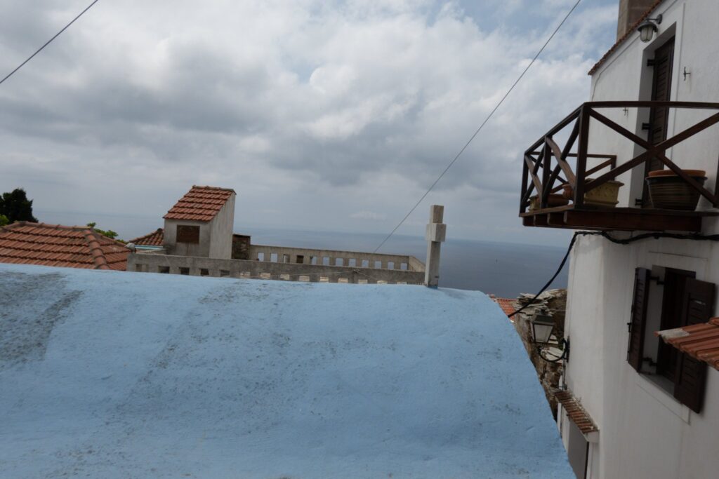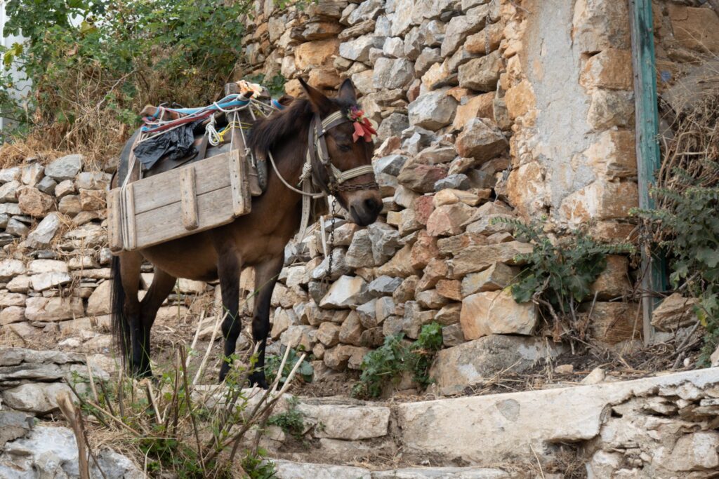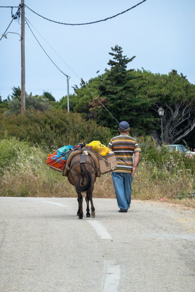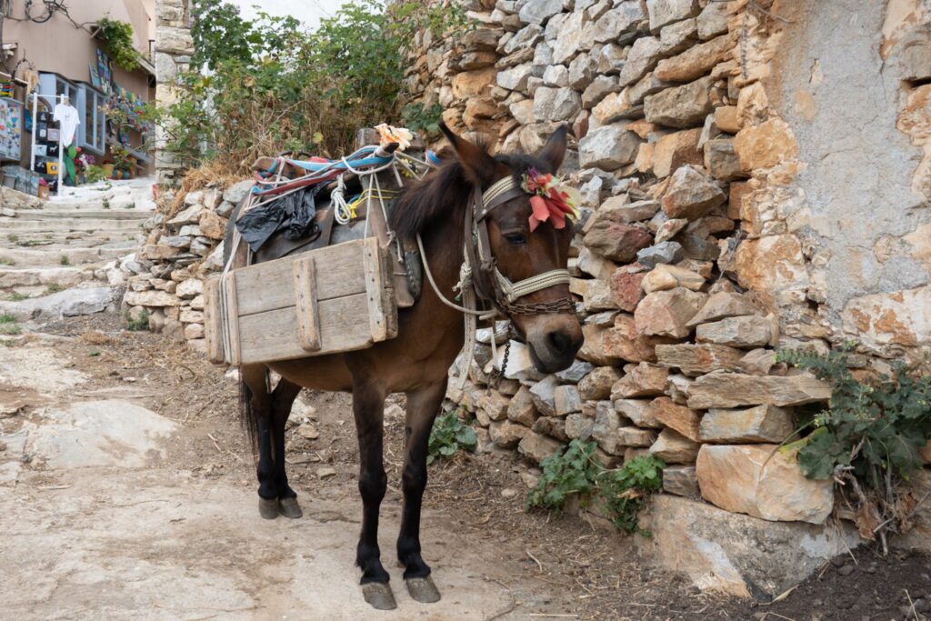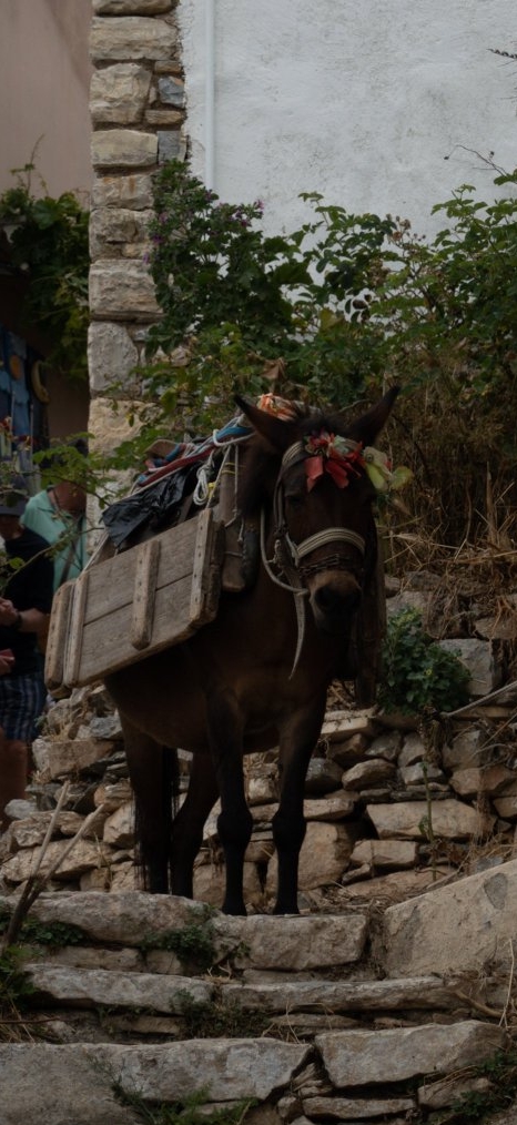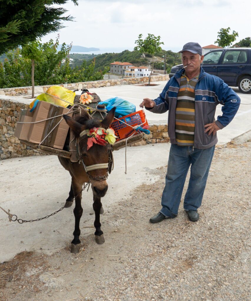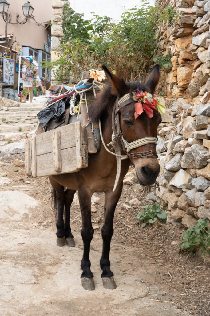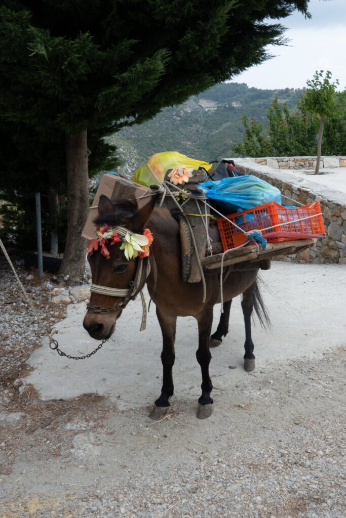 Nach dem gammeligen Alten zu was schönen Alten – zur Chora. Wie gestern erwähnt kann das bräunliche Wasser aus der Thermoskanne im Hotel Spuren von Kaffee enthalten, also genießt wir ein Kaffee am Hauptplatz der Chora. Ein bißchen spazieren, ein bißchen einkaufen, ein bißchen fotografieren, ein bisschen Drohne fliegen. Der Ort ist wirklich nett. Hier treffen wir auch auf Sancho (oder Dimitri, Giorgo ….. keine Ahnung) und seinen Esel. Zwei oder dreimal am Tag werden die Massen mit Bus herauf transportiert, dann wird es hektisch, aber dazwischen ist es angenehm ruhig, wenigstens bei unseren Besuchen.
