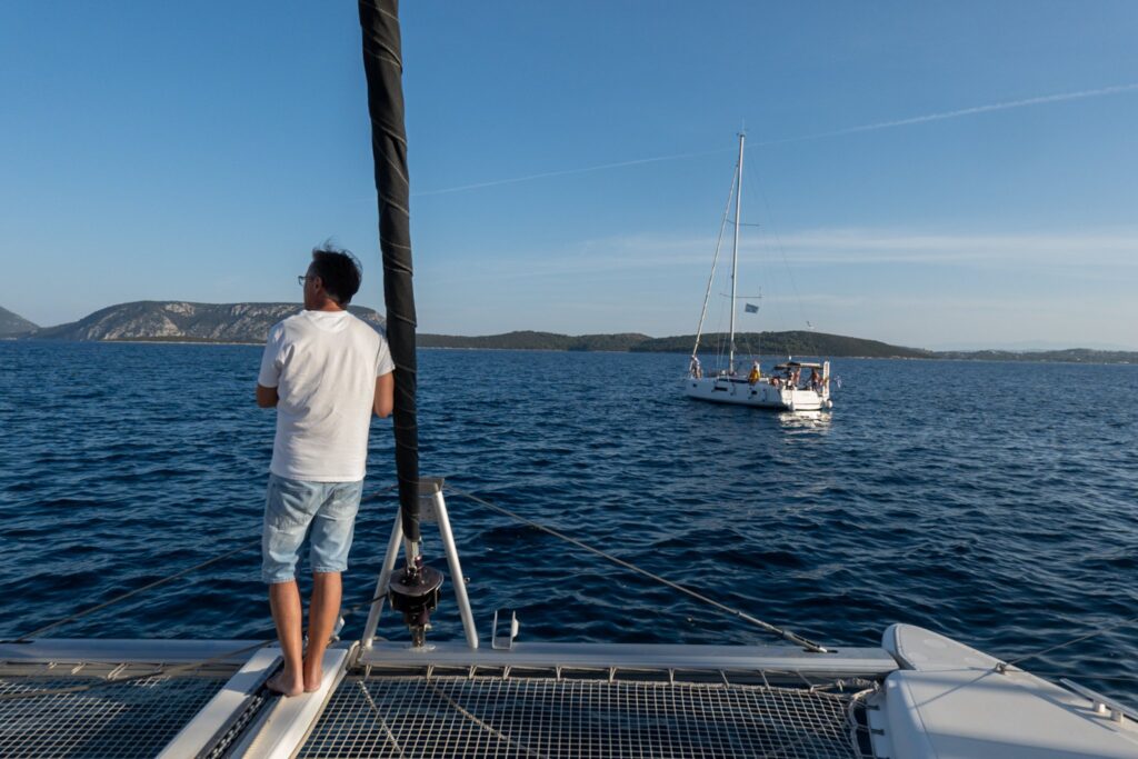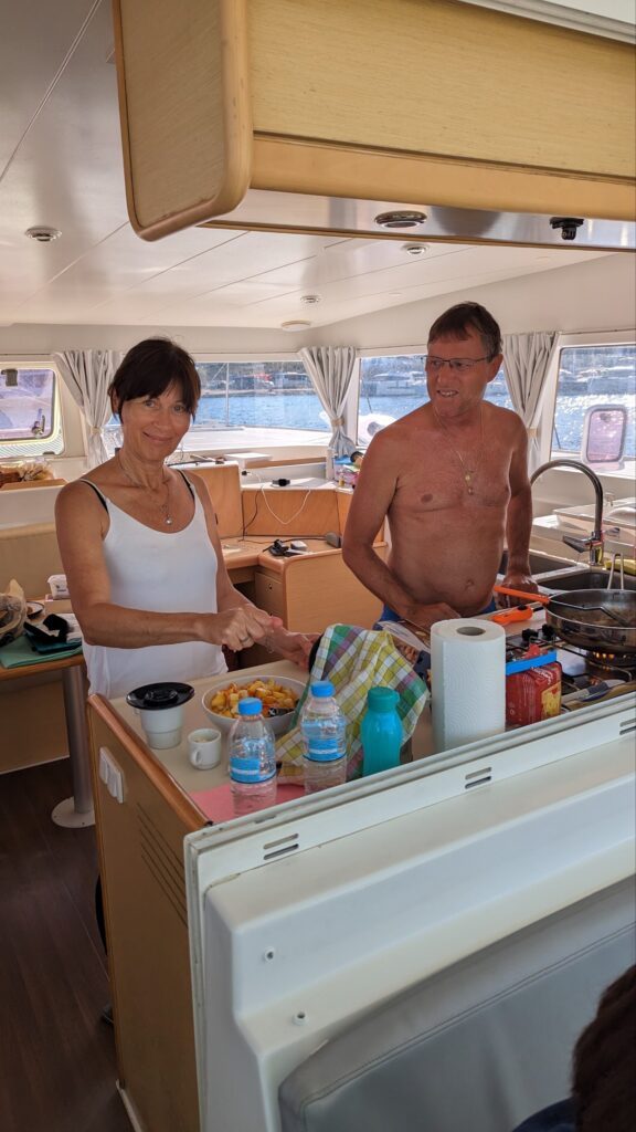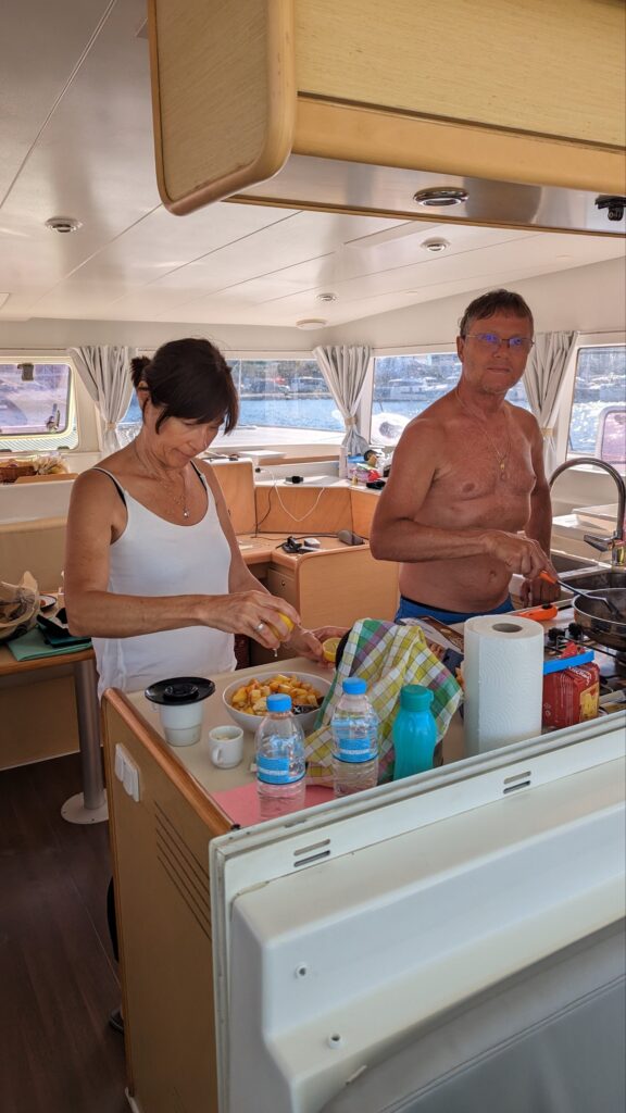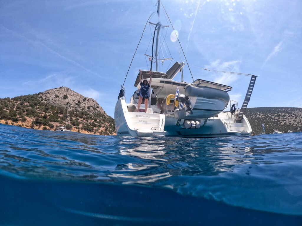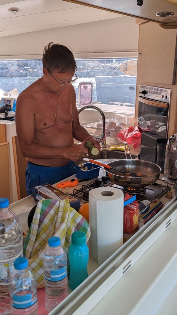 Wir frühstücken am Boot und laufen aus. Der Wind kommt aus Osten und so können wir Segeln setzen, unser Ziel heute: Ermioni auf dem Peloponnes. Gemütlich segeln wir zu einer Badebucht nach Hydra, auf der Insel Dokos. Leider ist er sehr voll, aber wir werfen trotzdem den Anker und genießen das Wasser. Bedient werden wir von der Prinzessin-Smutje Anita.