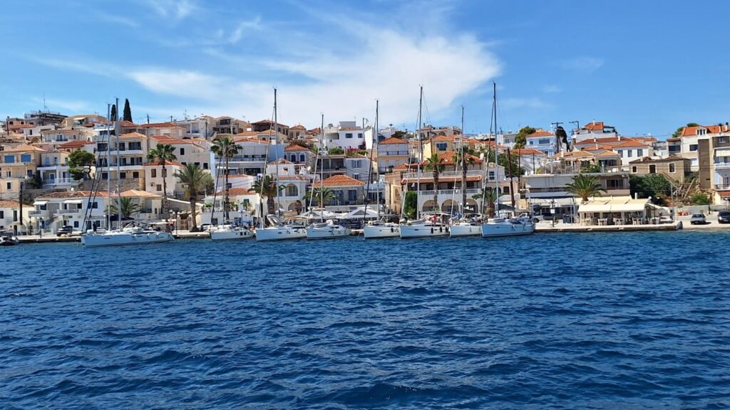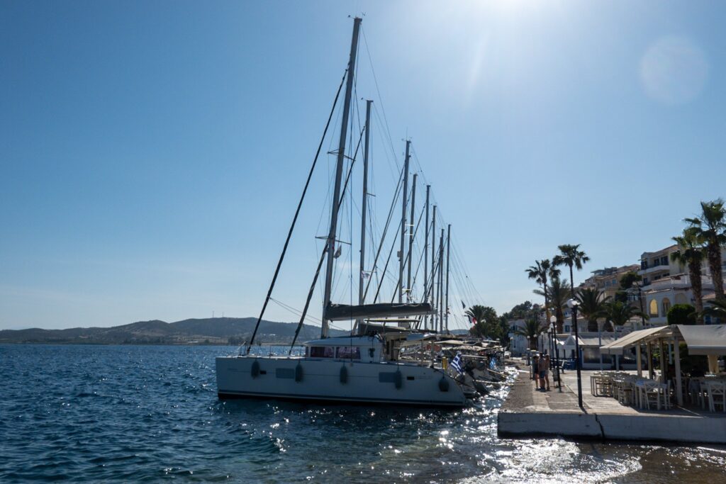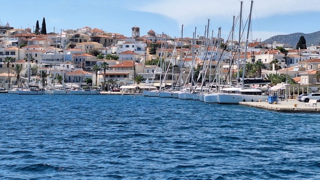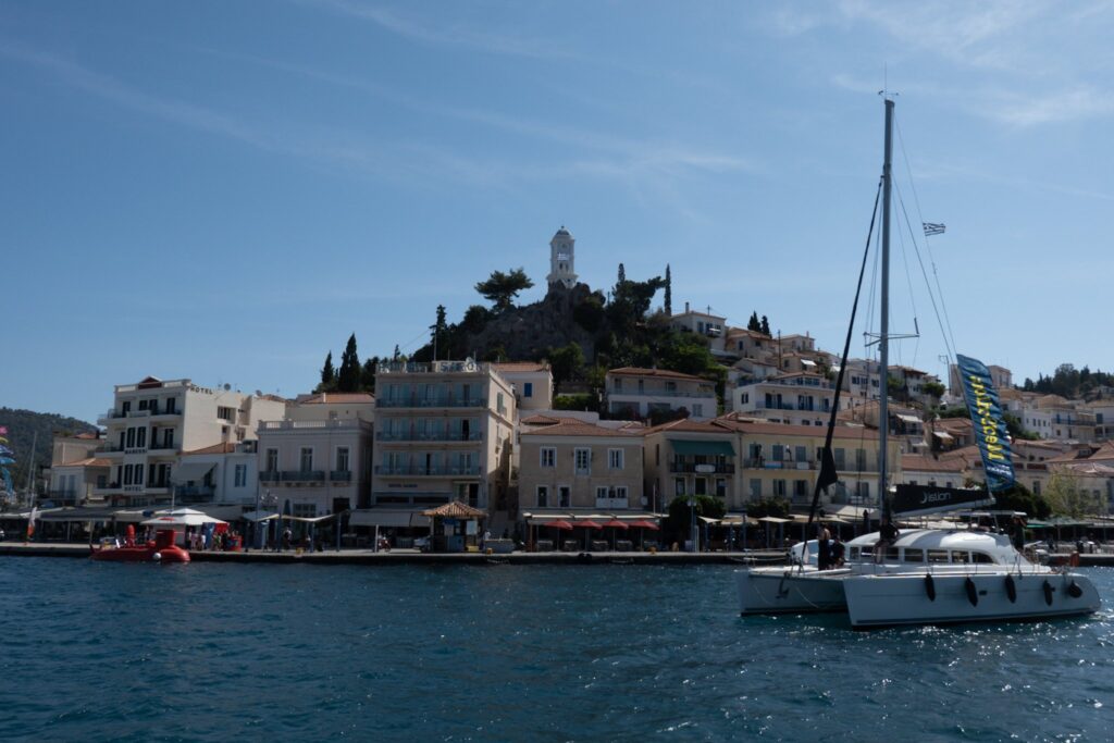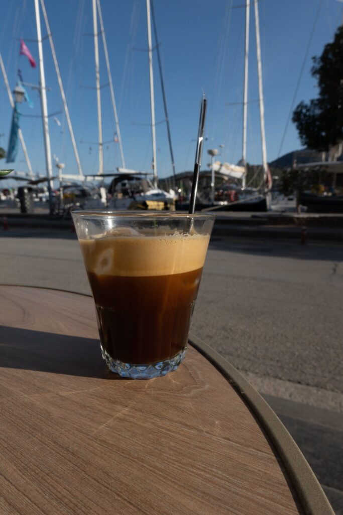 Die Nacht in Poros war extrem ruhig. Ein kleiner Spaziergang zum Uhrturm am Morgen, ich fliege eine Runde mit der Drohne, am Morgen störe ich keinen. Am Hafen treffe ich Ingrid und Alois und wir gehen einen Kaffee trinken, und schon wieder wird der Greek Coffee nur in einer Tasse serviert, nicht in der Kanne. Auch der Rest der Crew gesellt sich zu uns.