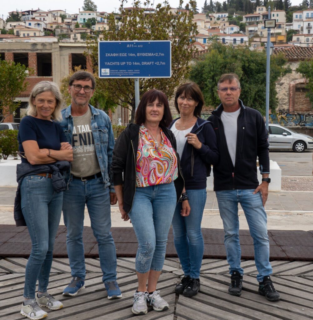 In Poros finden wir einen lässigen Platz am Schwimmsteg, nur das anlegen macht Probleme. Die Ankerkette ist zu kurz, und beim hochholen der Kette heben wir die Ankerkette eines anderen Segelbootes an. Aber der Skipper bleibt cool und mit vereinten Kräften, und der Hilfe des anderen Skipper, bekommen wir unseren Anker wieder frei. Zweiter Anlauf wieder Anker raus, und wieder ein paar Meter zu kurz. Auf einmal ruft das bisher sehr brave Ankergirl Brigitte, die Kette hat sich verknotet und wir haben noch 30m Reserve, nachdem dieser fast gordische Knoten gelöst ist, legen wir erfolgreich an. Wir feiern bei einem Manöverschluck und das Kielholen des Ankergirls wird knapp 4:2 abgelehnt. Wir rechnen ihr die Unerfahrenheit an und sind gnädig.