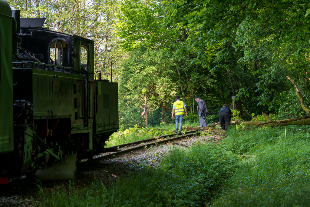 Zwischen den Stationen Stainz und Preding stiegen wir aus, um die Umgebung zu erkunden. Ein echtes Erlebnis: Mitten auf der Strecke lag ein Baum! Die Lokführer nahmen es gelassen, zersägten ihn und beseitigten das Hindernis.