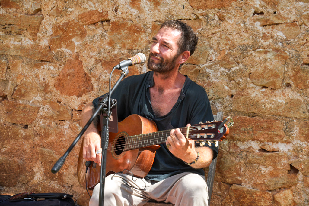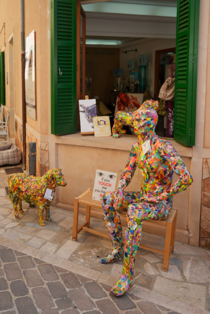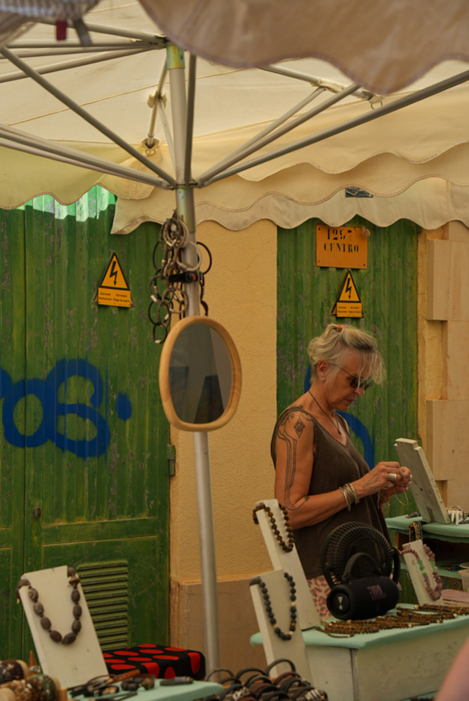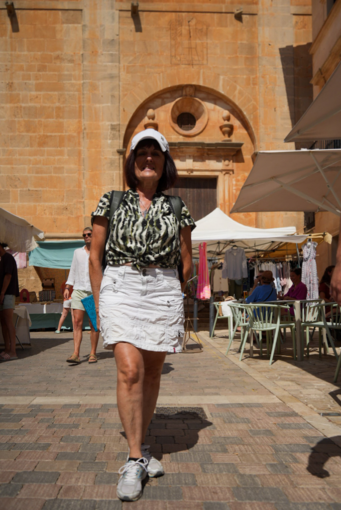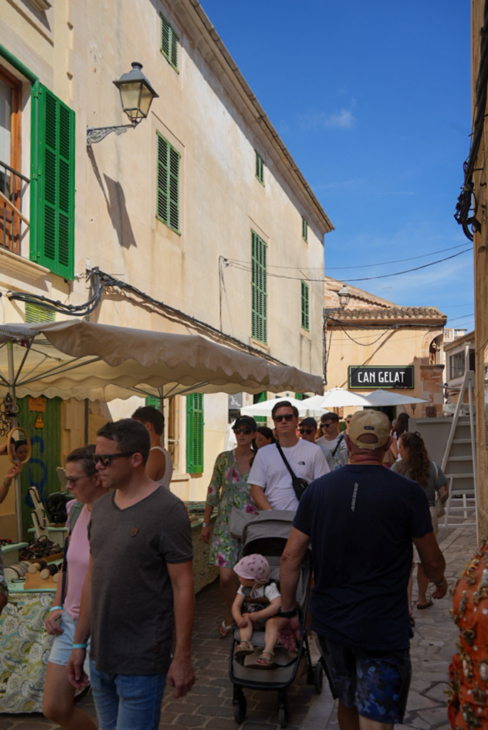 Nach dem guten Frühstück in der Finca beschließen wir, nach Santanyí zu fahren – laut Brigitte ein beschaulicher Ort. Denkste. Wir steuern das Zentrum an und bekommen einen Parkplatz an der Straße. Nach ein paar hundert Metern Fußmarsch spürt man die Energie: Das ganze Dorf wirkt wie ein riesiger Bienenstock. Menschen wimmeln überall, und die Gassen füllen sich mit Ständen, an denen alles angeboten wird, was das Herz begehrt. Der Duft von frischem Gemüse, Gewürzen, Kräutern und gebratenen Mandeln liegt in der Luft. Die Farben explodieren förmlich, von leuchtend roten Tomaten bis zu handgefertigten Körben.